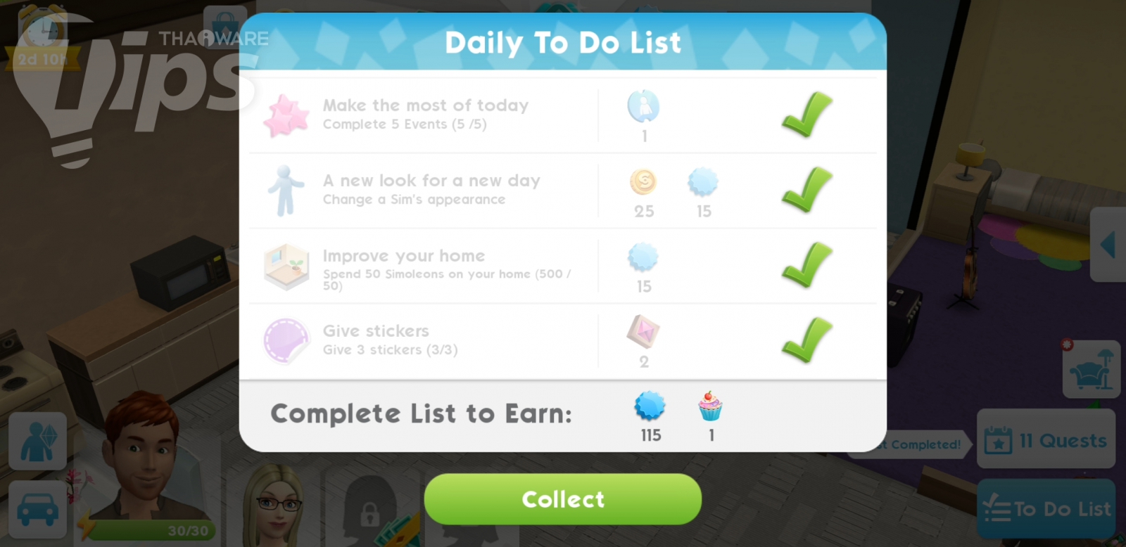 เกมส์ใดๆ ก็ตามที่มีรูปแบบการให้บริการเป็น Free to Play การทำภารกิจแบบรายวัน ก็ดูจะเป็นระบบที่ผูกขาดกันไปอย่างเลี่ยงไม่ได้เลยละครับ แต่กระนั้นส่วนดังกล่าวใน The Sims Mobile นี้ ก็ถือว่าทำออกมาแฟร์กับผู้เล่นใช้ได้อยู่นะ เพราะค่าประสบการณ์ที่ได้จะมีมากถึง 130 - 150 (หรืออาจจะมากกว่านั้น) เลยทีเดียว อีกทั้งในแต่ละวันก็จะเป็นการทำกิจกรรมแบบเดิมๆ ที่มีข้อกำหนดที่ตายตัวดังนี้
