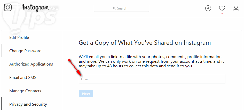 จากนั้นให้เราใส่อีเมลที่จะให้ทาง Instagram ส่งลิงค์ดาวน์โหลดมาให้ครับ ก็กรอกลงไปเสร็จแล้วก็คลิกปุ่ม Next