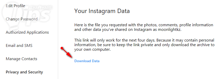 หลังจากนั้น ให้เราเข้าไปเช็คอีเมลของเรา จะมีอีเมลจาก Instagram ส่งมาให้ (ทั้งนี้ หลังจากส่งคำขอไป ก็ต้องรอเป็นระยะเวลาหนึ่ง ซึ่งอาจจะต้องรอถึง 48 ชั่วโมง เลยทีเดียว ขึ้นอยู่กับปริมาณการใช้งาน Instagram ของเราว่าเล่นเยอะขนาดไหน และหลังจากที่เราส่งคำร้องขอไปแล้ว ต้องรออีก 4 วัน ถึงจะส่งคำขอครั้งใหม่ไปได้อีกครั้ง) ก็คลิกที่ปุ่ม Download Data ได้เลยครับ