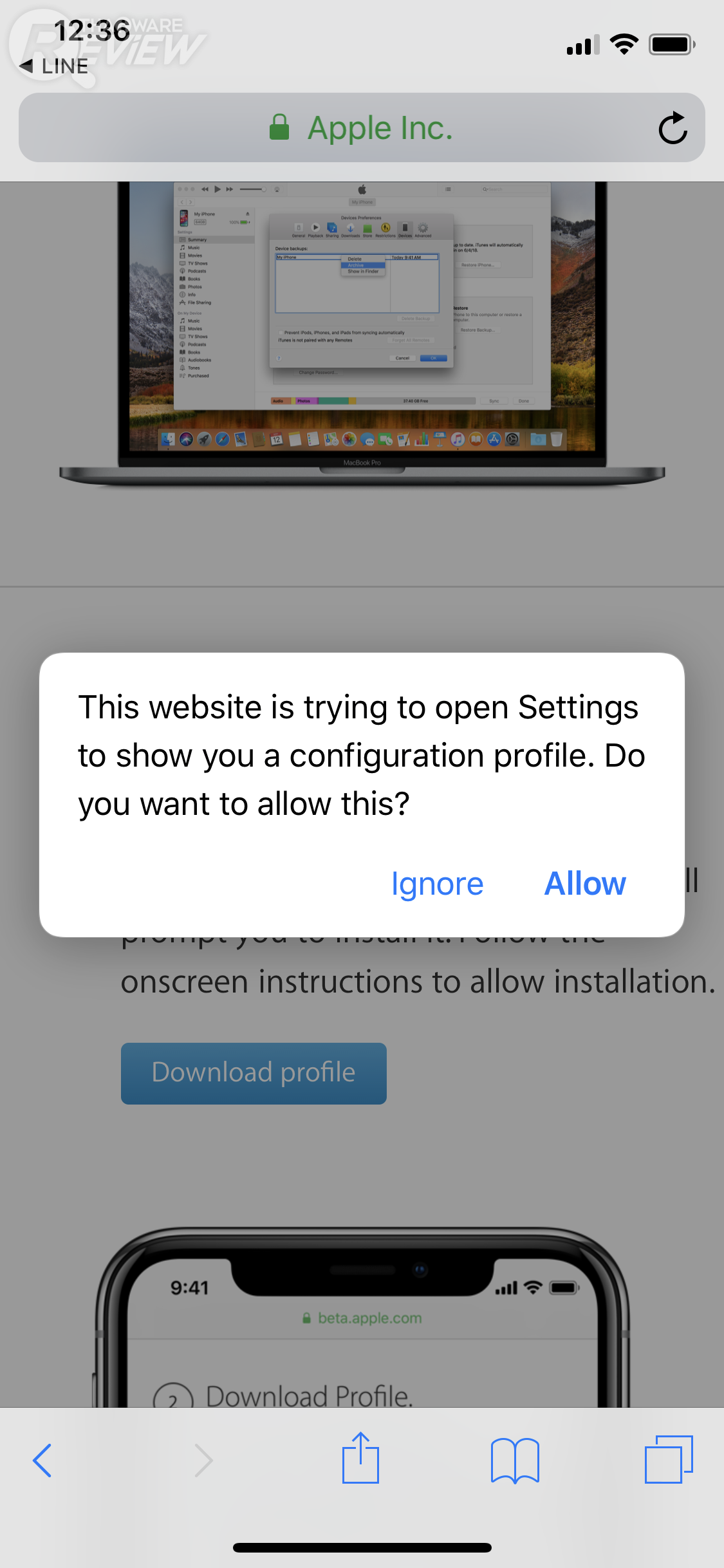 เลื่อนหาปุ่ม Download profile แล้วแตะเข้าไป จะมีแจ้งเตือนเพื่อเปิดหน้าต่าง Settings เลือก Allow