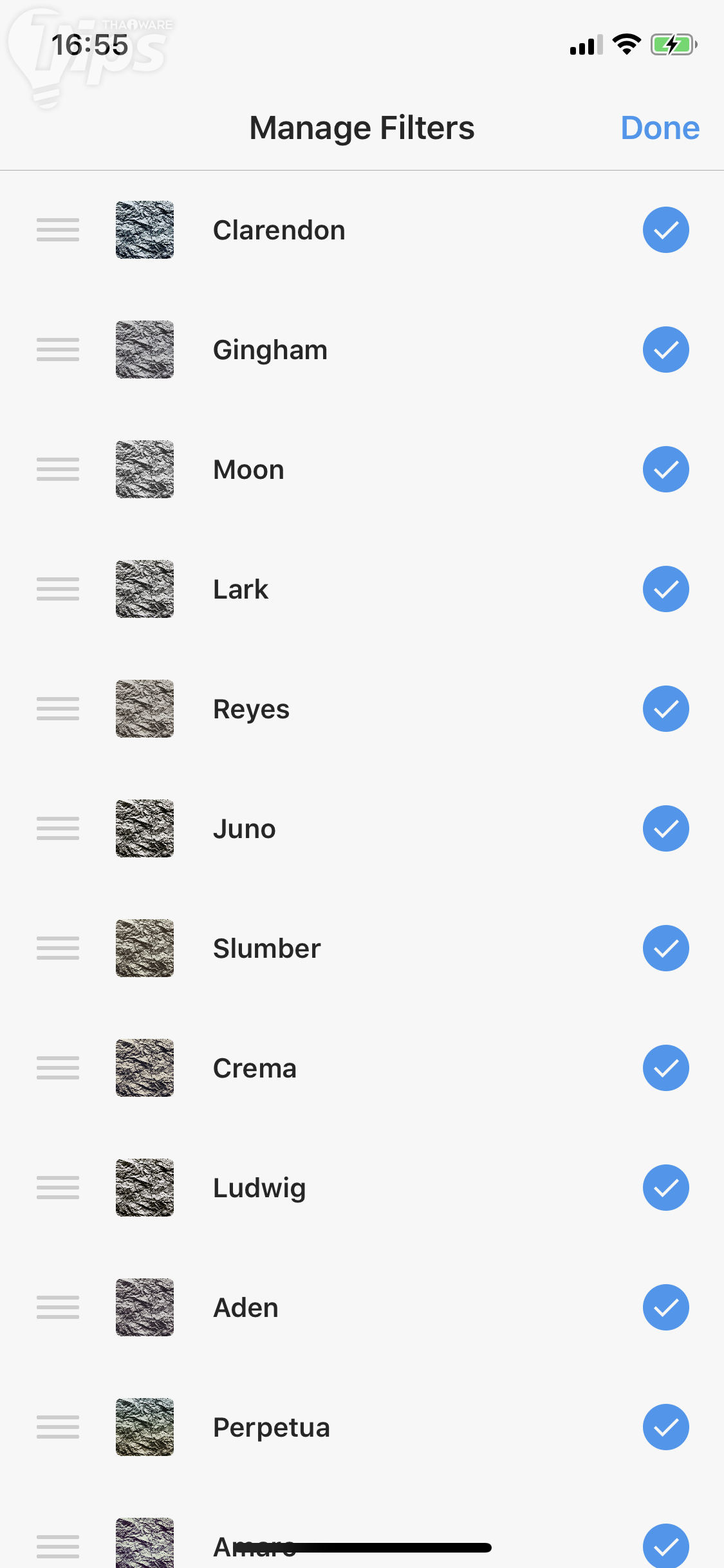 สำหรับคนที่อ่านมาถึงบรรทัดนี้แล้วพบว่า เฮ้ย Instagram ในเครื่องเราไม่เห็นมีฟิลเตอร์เหมือนด้านบนเลย ก็ไม่ต้องตกใจไป ให้เราสร้างโพสขึ้นมาสักอัน พอถึงหน้าเลือกฟิลเตอร์ เลื่อนไปขวาสุด แตะไปที่ Manage จากนั้นแตะไปที่ฟิลเตอร์ที่ต้องการให้มีเครื่องหมายถูกเครื่องมา แล้วแตะ Done