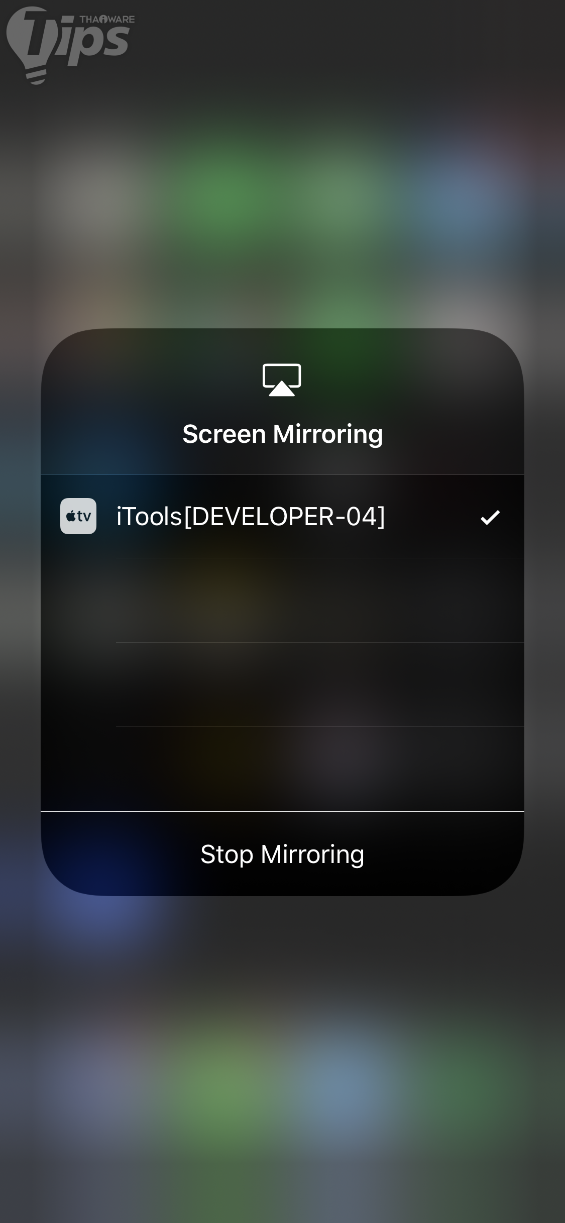 จากนั้นให้เราหยิบ iPhone/iPad ของเราขึ้นมา เปิดหน้า Control Center แล้วแตะไปที่ปุ่ม Screen Mirroring จะเห็น Apple TV ที่ชื่อว่า iTools[ชื่อคอมพิวเตอร์ของเรา] ก็แตะเพื่อทำการส่งภาพเข้าคอมฯ ได้เลย ***บนคอมพิวเตอร์ต้องเปิดโปรแกรม iTools AirPlayer เอาไว้ด้วยนะ***