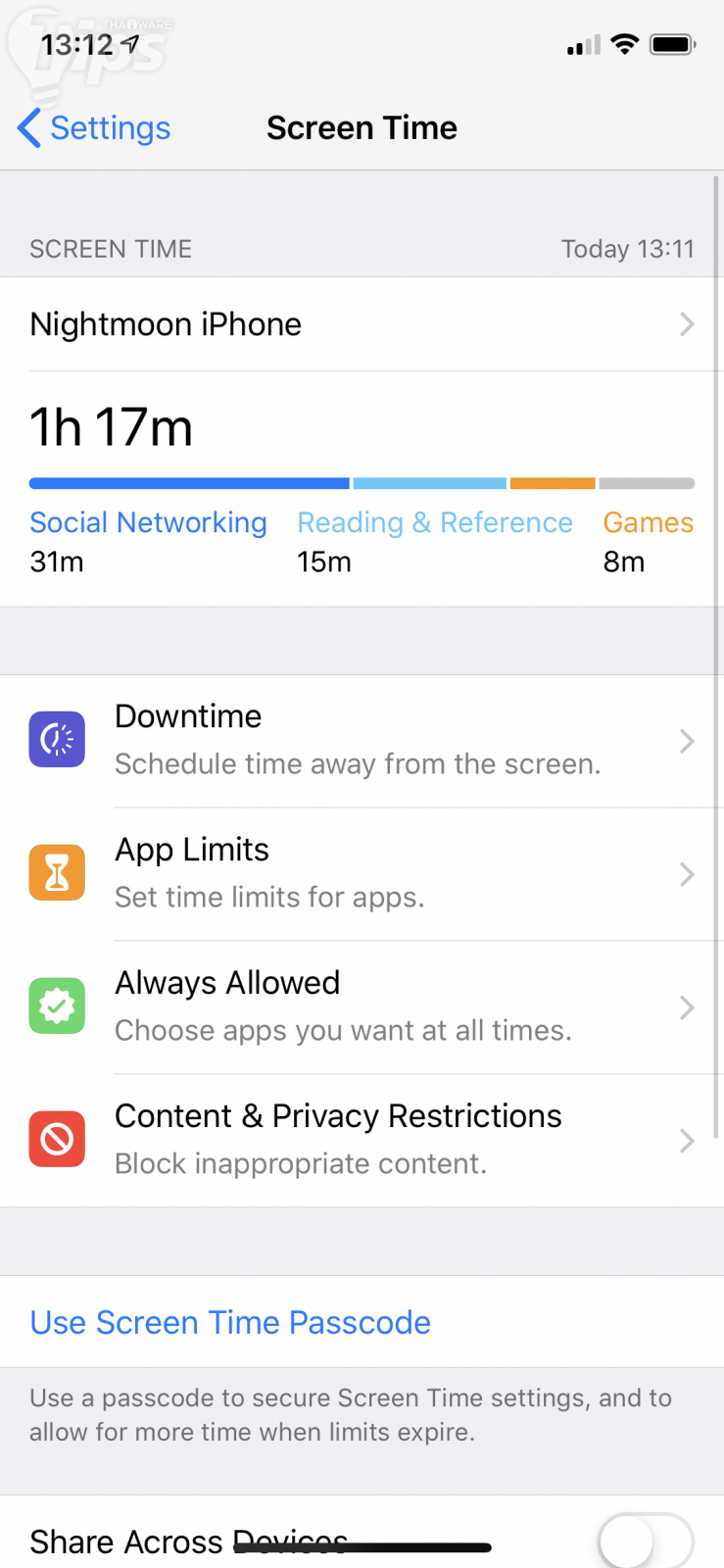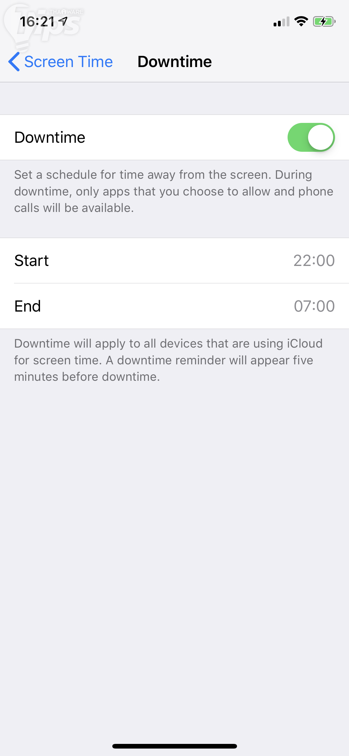 Downtime นั้นทำงานคล้ายกับ Do not Disturb แต่ว่ามีตัวเลือกในการปรับแต่งที่ละเอียดกว่า คุณสมบัตินี้เป็นส่วนหนึ่งของ Screen Time มันสามารถตั้งให้เฉพาะแอปฯ ที่เราเลือกไว้ ยังสามารถแจ้งเตือนได้ เผื่อไว้ในช่วงที่เราอาจมีความจำเป็นบางอย่าง