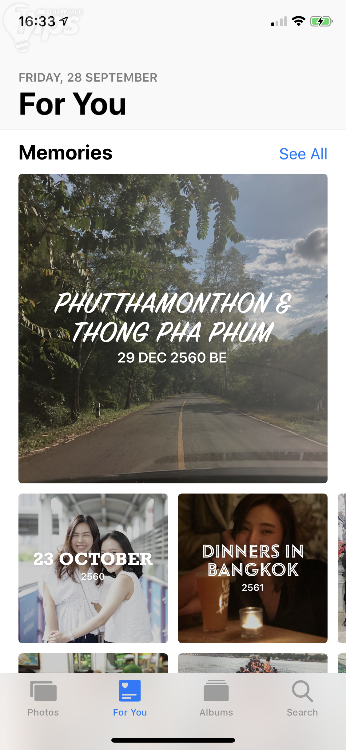 ใน iOS 12 นั้น Photo gallery ได้มีลูกเล่นใหม่ถูกใส่เพิ่มเข้ามา แท็บ For You จะโชว์ภาพในความทรงจำของเรา และยังมี Sharing Suggestion ที่จะรวมภาพที่วิเคราะห์แล้วว่าเราน่าจะอยากแชร์ให้เพื่อน หรือคนในครอบครัวได้ดู