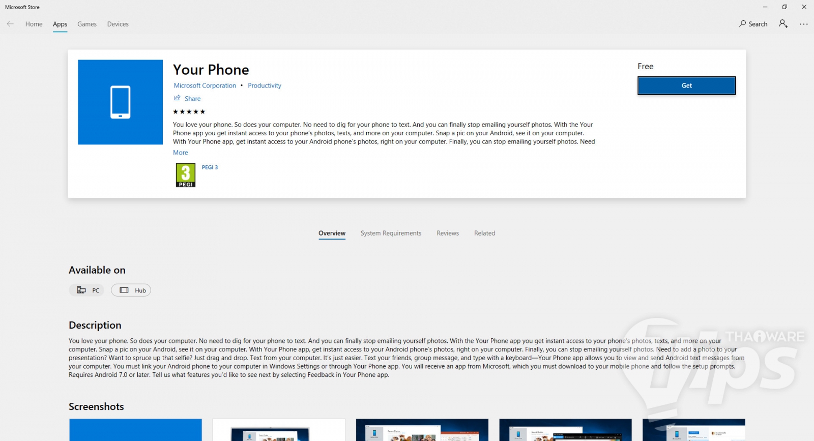เปิด Windows Store ค้นหาคำว่า Your Phone หรือถ้าหาไม่เจอ เข้าไปโหลดตามลิ้งนี้ได้เลย