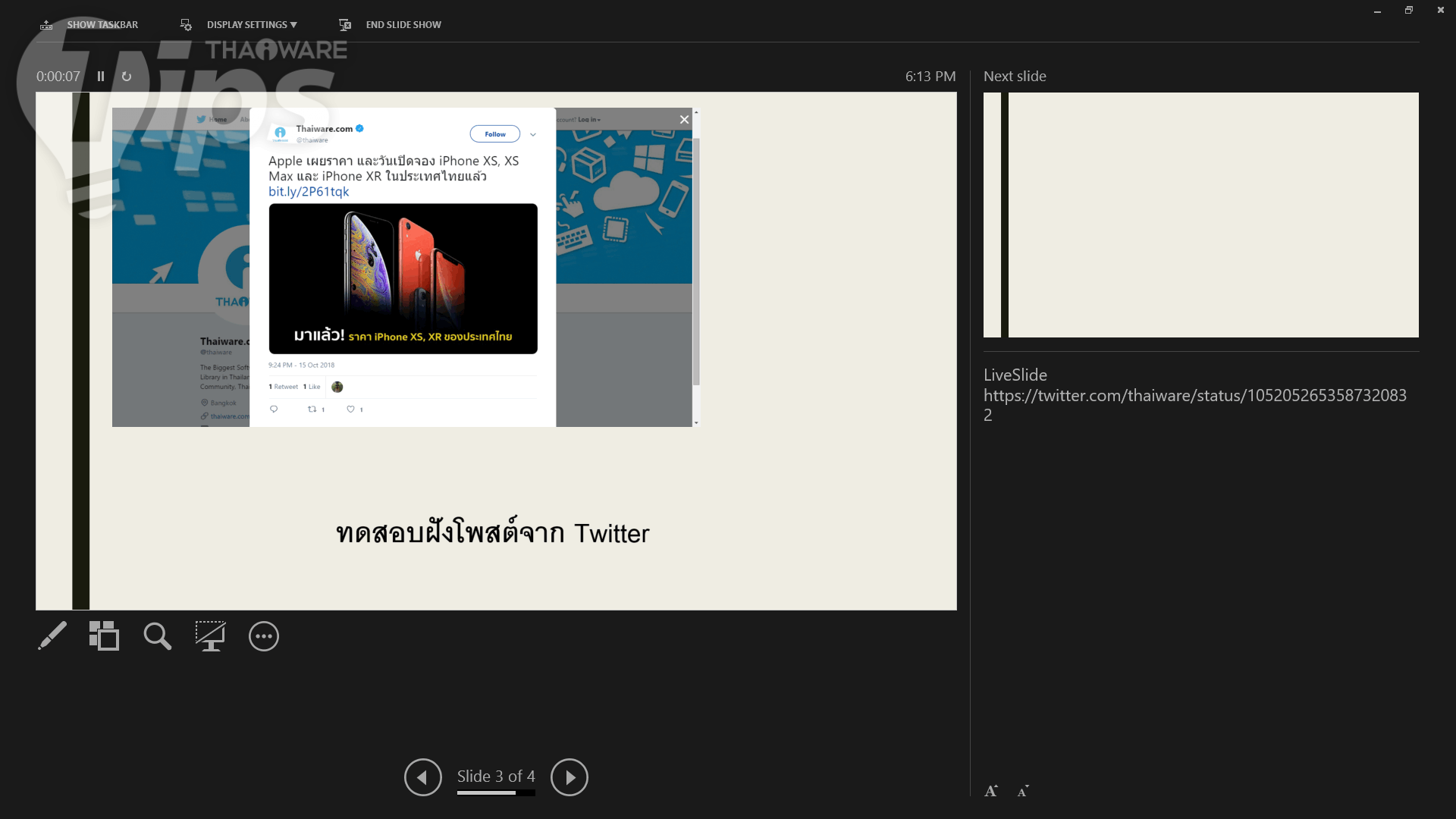 การจะฝัง (Embed) วิดีโอจาก YouTube ลงใน PowerPoint นั้นไม่ใช่เรื่องยากอะไร แต่หากจะฝังมีเดียอื่่นๆ ลงในเว็บนี่ไม่ง่ายเลย ซึ่งเจ้า LiveSlides นี้จะช่วยให้เราฝังเนื้อหาจาก YouTube, Vimeo, Twitter, Poll, Google Calendar, Outlook Calendar, Google Maps, Asana, Google Docs หรือเว็บแอปฯ อื่นๆ ลงในสไลด์ได้อย่างง่ายดาย ด้วยขั้นตอนง่ายๆ แค่ Copy ลิงก์มาแปะก็เท่านั้น ที่เห็นในภาพไม่ใช่แคปเจอร์จอมานะครับ แต่เป็นฝังมาเลย เราสามารถคลิกขยายภาพในทวีต คลิกลิงก์ในทวีตได้โดยตรง