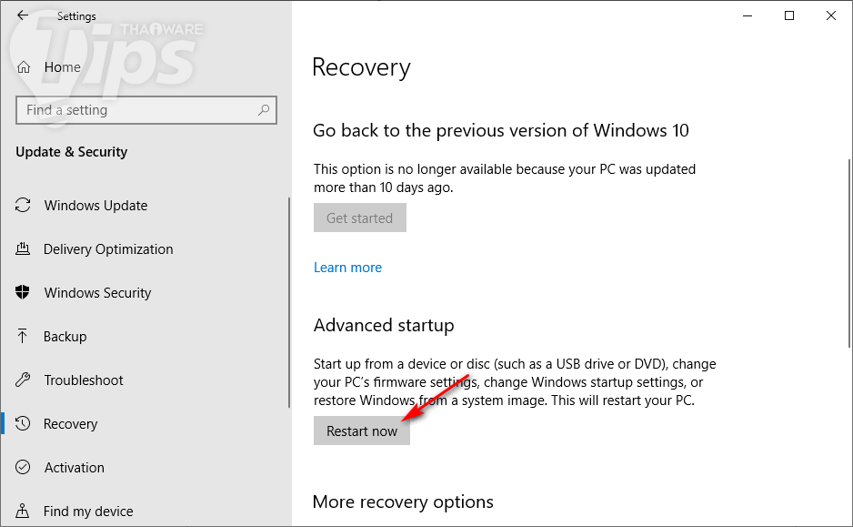 ให้เราไปที่เมนู Start → Settings (Windows + I) → Update & Security → Recovery ดูที่ใต้หัวข้อ Advanced startup คลิกไปที่ "ปุ่ม Restart Now"