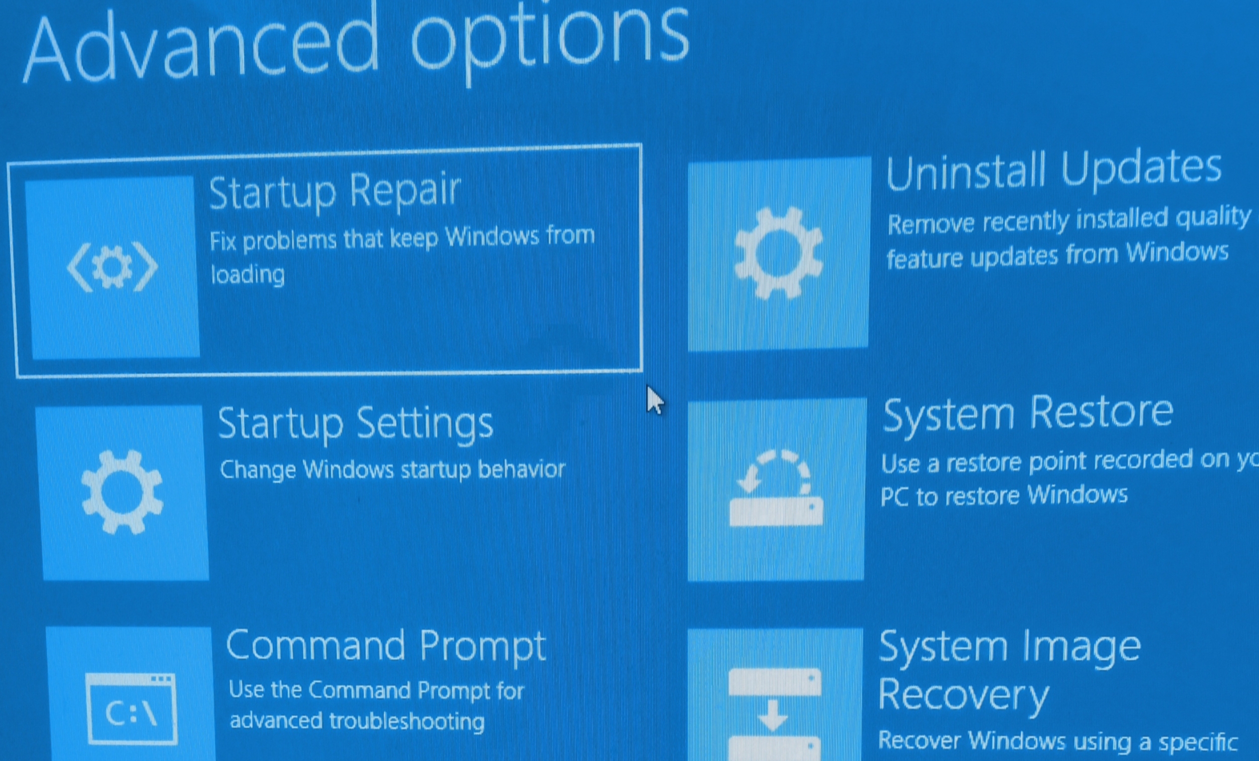 เปิด Charms Bar ด้วยการกด "ปุ่ม Windows+C" (บนคีย์บอร์ด) จากนั้นคลิกไปที่ "ปุ่ม Settings" แล้วเลือก Change PC settings ที่อยู่บริเวณขวาล่าง จากนั้นไปที่แท็บ General แล้วคลิก "ปุ่ม Restart Now" ที่อยู่ใต้ Advanced startup