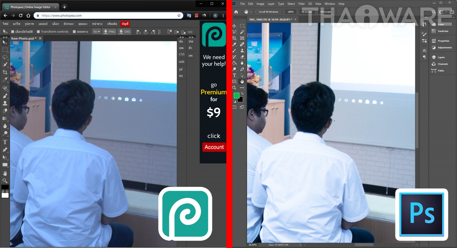 ความฉลาดในการแต่งรูปภาพแบบอัตโนมัติ (ปรับแสง แต่งสี เพิ่มเอฟเฟค) ของ Photopea ยังห่างชั้นกับ Adobe Photoshop อยู่มาก