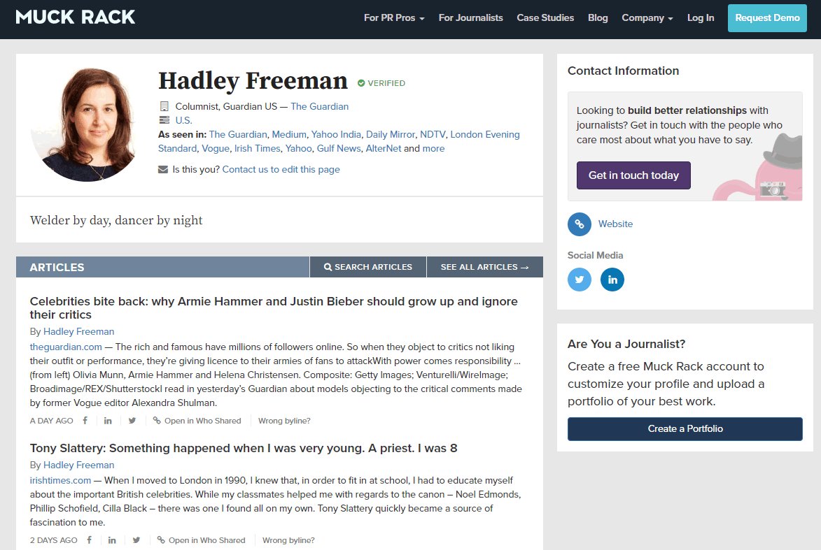 Muckrack.com เหมาะสำหรับคนสายข่าว หรือนักเขียนเป็นอย่างมาก แม้ว่าเว็บนี้จะไม่ให้อิสระเราในการปรับแต่งหน้าโปรไฟล์มากนัก อย่างไรก็ตาม การปรับแต่งเนื้อหาก็ทำระบบมาให้ค่อนข้างดี