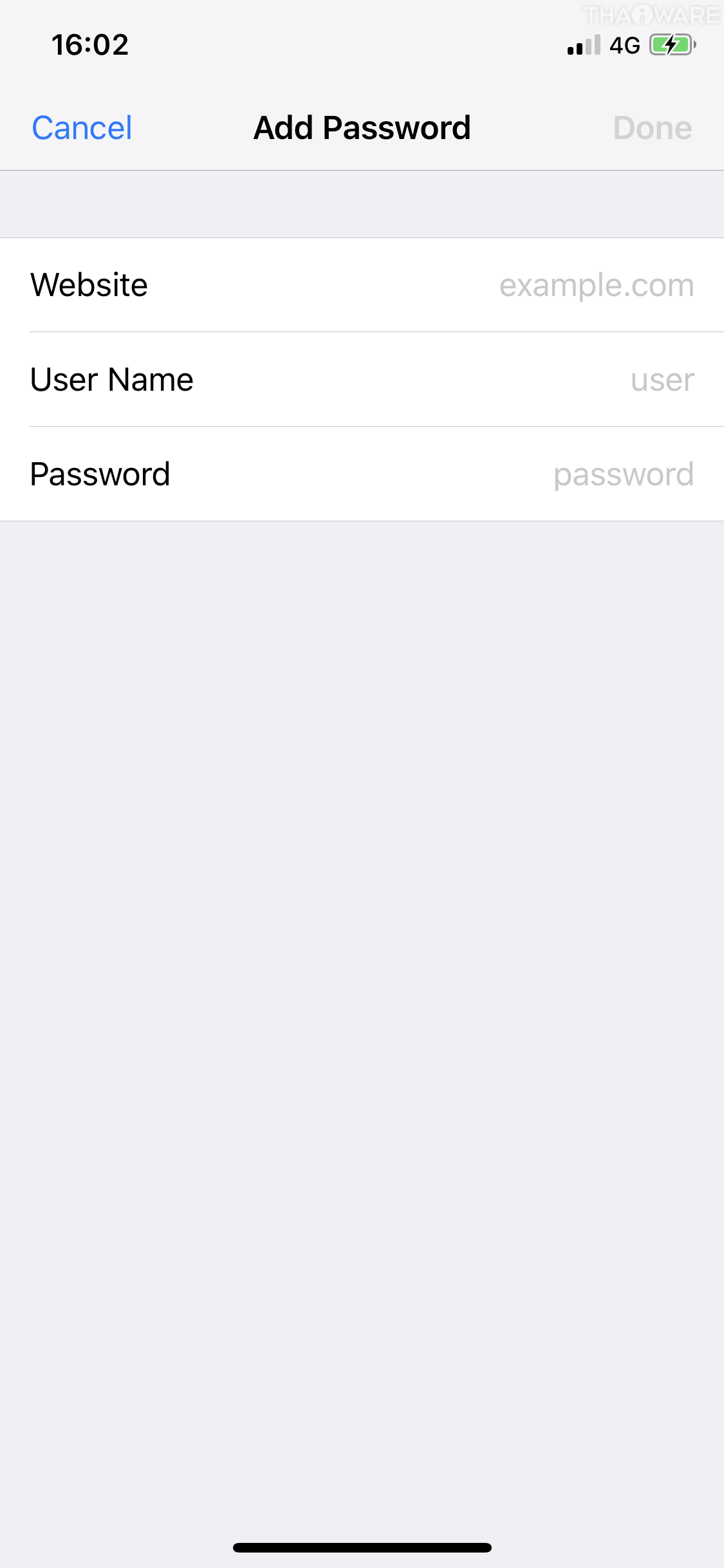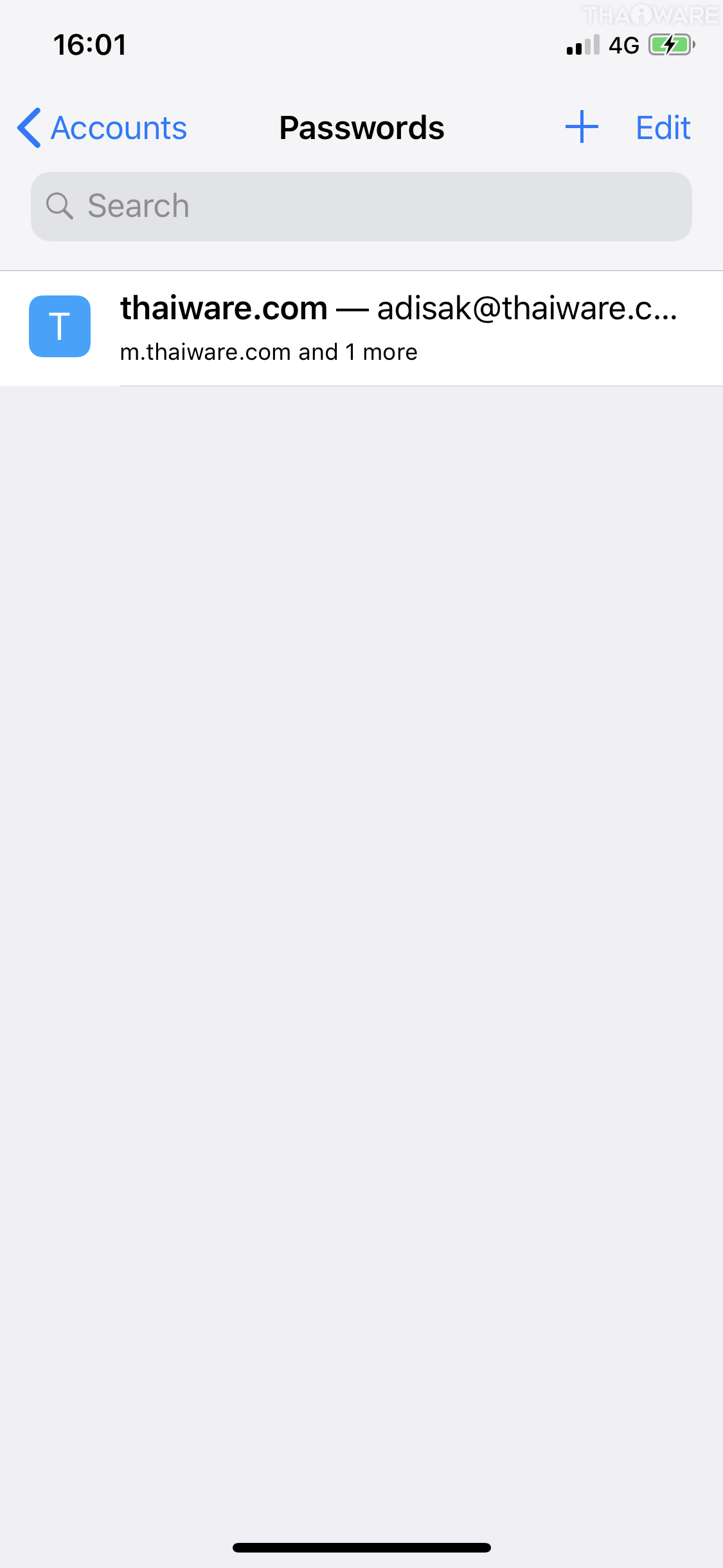 แตะที่ปุ่ม + ที่มุมขวาบนเพื่อเพิ่มข้อมูล (ในภาพมีบันทึกไว้แล้ว 1 เว็บไซต์) สิ่งที่เราต้องกรอก ก็จะมี URL, ชื่อบัญชี และรหัสผ่าน เมื่อเรียบร้อยแล้ว ให้เราคลิก Done เพื่อบันทึกการตั้งค่า
