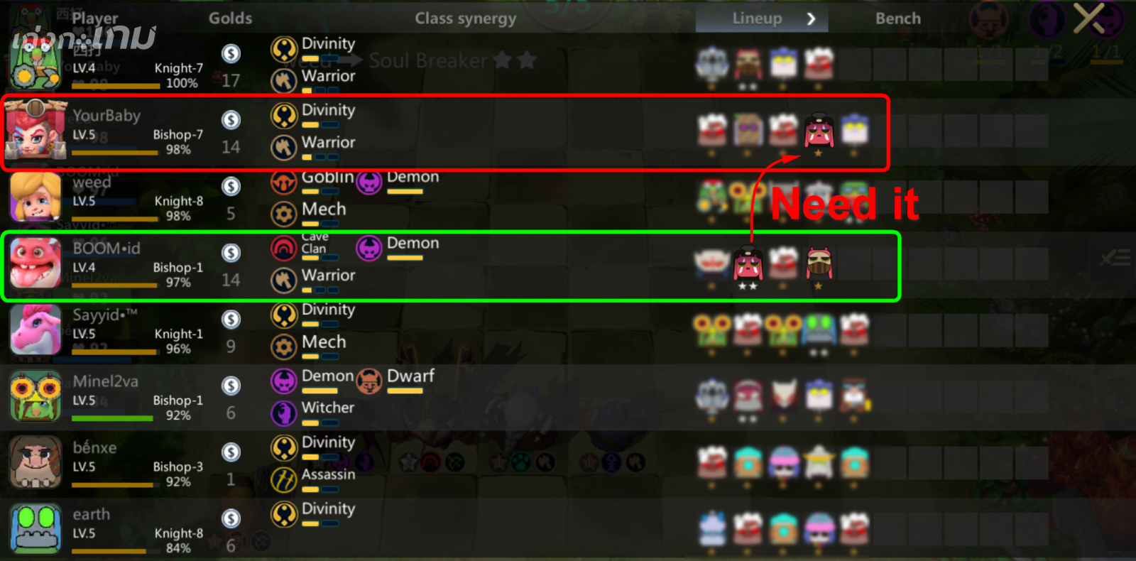 วิธีเช็คไม่ยาก ให้เปิดแถบ "สกอร์บอร์ด" ออกมา จากนั้นก็เช็คดูรายคนเลยว่าทั้ง 7 คนที่เหลือเขาเลือกตัวไหนไปแล้วบ้าง มีตัวไหนบ้างที่ยังไม่มีคนเลือก จากนั้นก็หาตัวนั้นมาเก็บสะสมไว้เรื่อยๆ ผสมเป็นสองดาว (☆☆) สองตัวและเอามาทำเป็นสามดาว (☆☆☆)