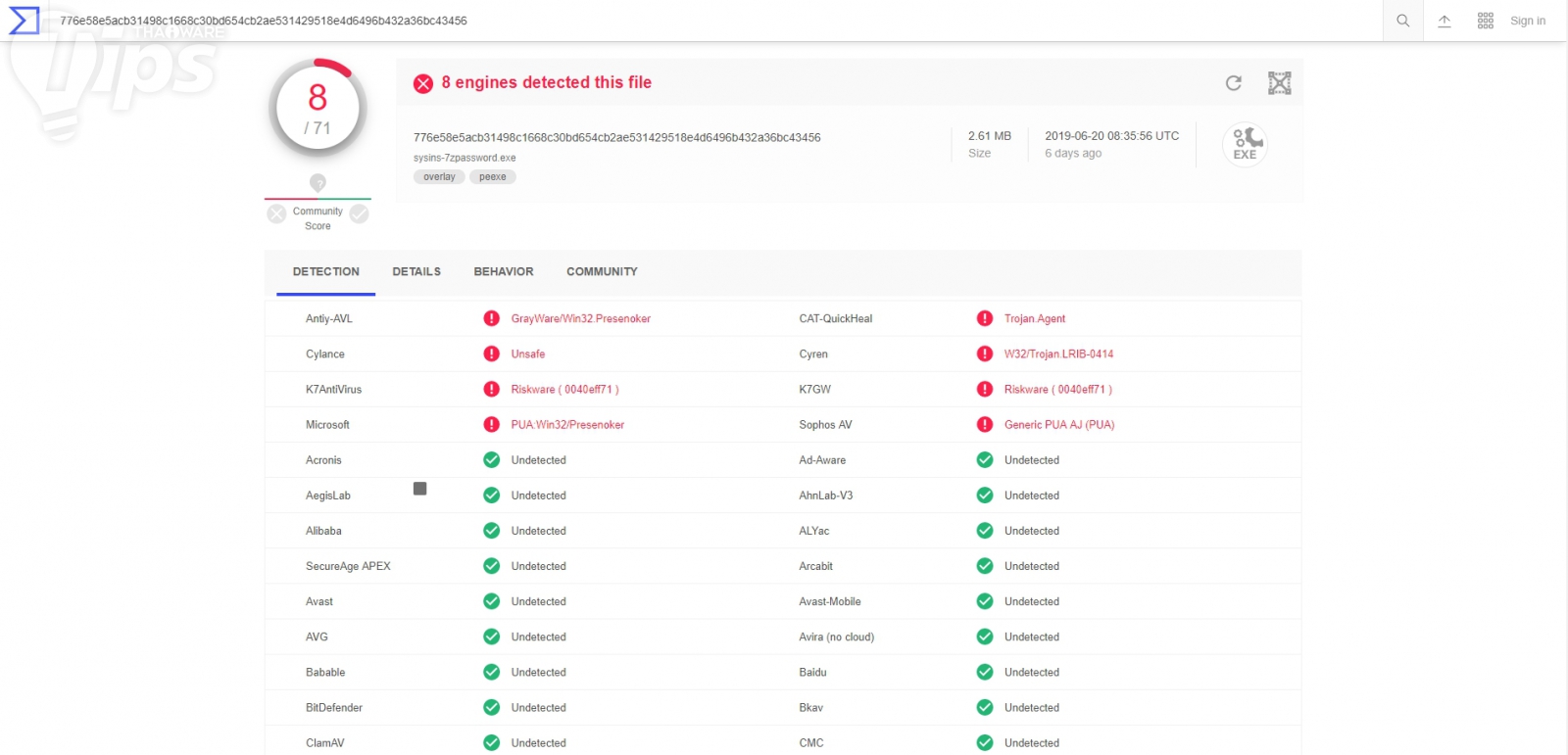 ข้อมูลที่แสดงขึ้นมาทั้งหมด มาจากค่ายแอนตี้ไวรัสกว่า 70 แบรนด์ โดยมีค่ายชื่อคุ้นหูอย่าง ESET-NOD32, BitDefender, AVG, Avast, Ad-Aware, Microsoft รวมอยู่ด้วย โดยในรายละเอียดที่แสดงให้เห็น มาจากลิสต์รายชื่อมัลแวร์ของค่ายแอนตี้ไวรัสแต่ละเจ้า ซึ่งบางครั้งอาจบอกไม่ตรงกัน แนะนำให้ดูเจ้าดังๆ เป็นหลัก