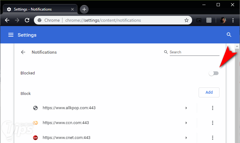 อย่างไรก็ตาม หากมีบางเว็บที่เราอยากให้มันยังส่งแจ้งเตือนได้อยู่ เช่น Twitter, Gmail ฯลฯ เราสามารถเพิ่มมันเข้าไปในรายการ Whitelist ที่ "อนุญาต" ได้ โดยด้านล่างตรงหัวข้อ Allow คลิกไปที่ปุ่ม Add แล้วใส่ URL ของเว็บไซต์ที่เราต้องการอนุญาตลงไป