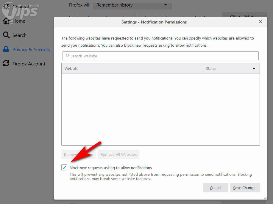 อย่างไรก็ตาม Firefox ไม่มีระบบ Whitelist เหมือนกับ Chrome หากต้องการอนุญาตให้เว็บไซต์ที่ต้องการ ต้องปิด “Block new requests asking to allow notifications” แล้วเข้าไปยังเว็บไซต์ที่ต้องการ เพื่อเปิดใช้การแจ้งเตือนบนเว็บนั้นเสียก่อน จากนั้นก็ค่อยปิดมันอีกที