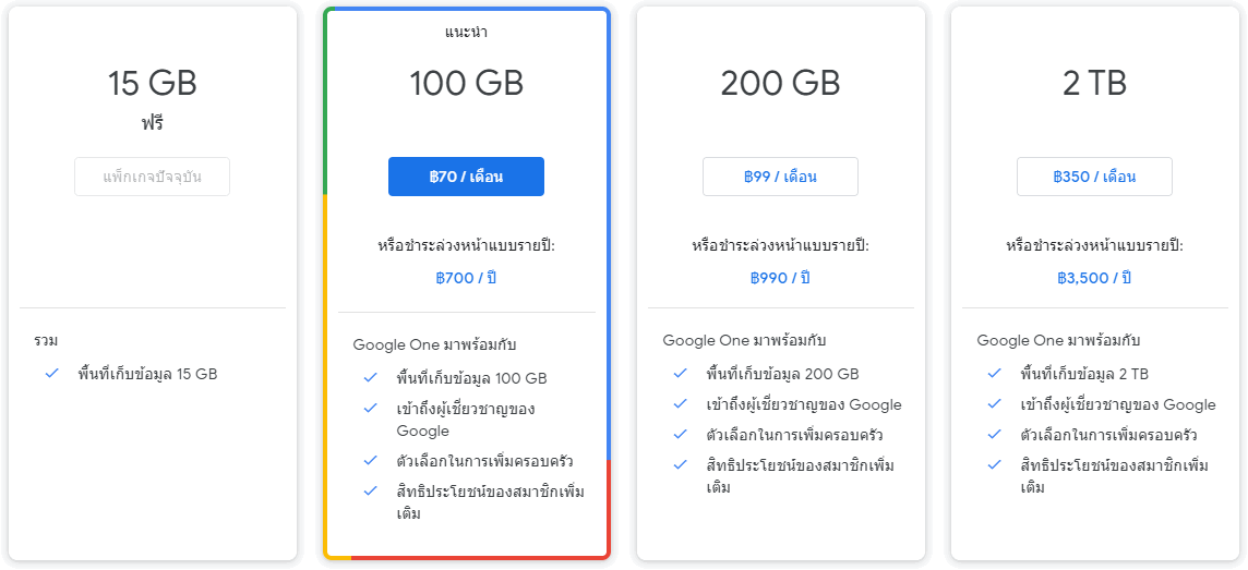 มีความแตกต่างในด้านนี้ค่อนข้างเยอะเลยล่ะ Google ให้พื้นที่เริ่มต้นฟรีมาถึง 15GB และสามารถจ่ายเงินเพิ่ม เริ่มต้นเพียงปีละ 700 บาท (เดือนละ 70 บาท) สำหรับพื้นที่ขนาด 100GB ซึ่ง Google รวมบริการคลาวด์ที่มีทั้งหมดเอาไว้ในชื่อ Google One พื้นที่ที่เราได้มาสามารถใช้งานร่วมกับ Drive และ Photos ได้ด้วย รวมทั้งยังแบ่งพื้นที่ให้กับสมาชิกในครอบครัวให้มาใช้งานได้