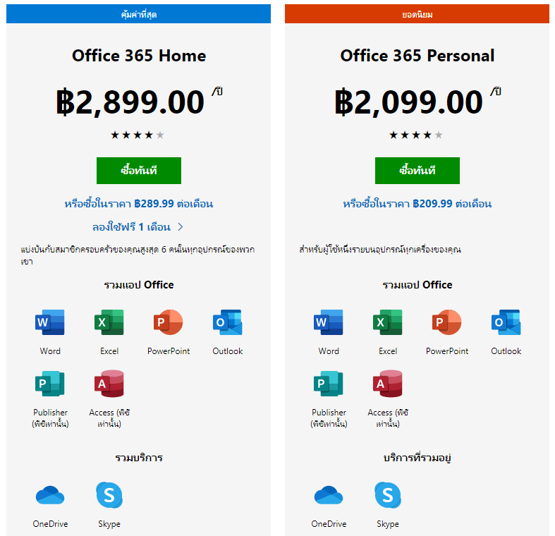 ในส่วนของ Microsoft จะมีความแตกต่างออกไป โดยพื้นที่จะถูกพ่วงมากับการสมัครบริการ Microsoft Office แบบรายเดือน ซึ่ง Office 365 Home มีราคาเริ่มต้นที่ปีละ 2,099 บาท ได้พื้นที่ 1TB พร้อมกับสามารถใช้งานซอฟต์แวร์ตระกูล Office ได้ด้วย หากต้องการใช้หลายคน (สูงสุด 6 คน คนละ 1TB) จะอยู่ที่ปีละ 2,899 บาท
