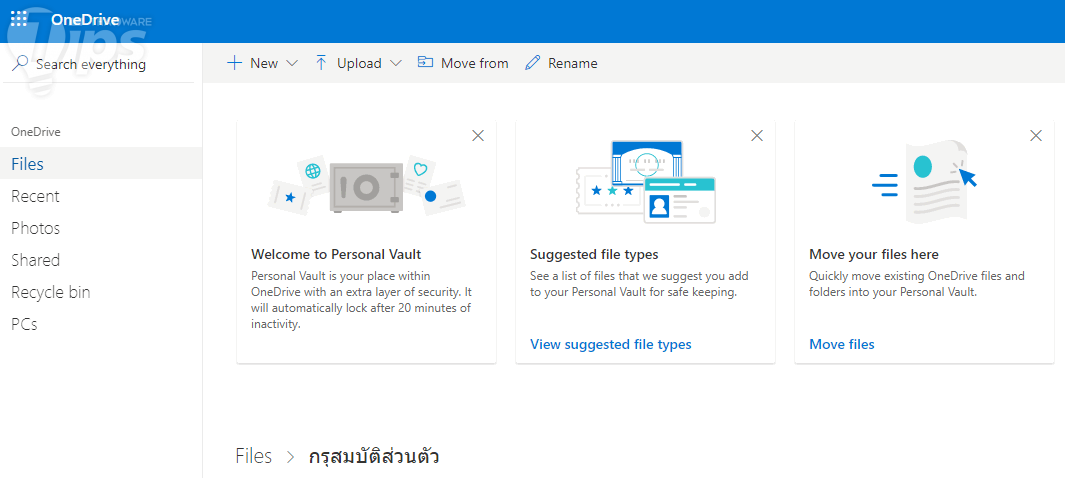 OneDrive มีลูกเล่นที่ชื่อว่า "กรุสมบัติส่วนตัว" (Peronal Vault) ให้เพื่อป้องกันเหตุการณ์ดังกล่าว มันไม่ได้มาช่วยเพิ่มการเข้ารหัสไฟล์ให้ซับซ้อนขึ้น แต่มันเป็นโฟลเดอร์ที่ถูกเพิ่มระบบรักษาความปลอดภัยให้เข้มงวดขึ้นอีกระดับ ด้วยการใช้ Two Factor Authentication โดยเราอาจจะตั้งค่าให้ใช้ต้องใส่รหัสผ่านชั่วคราวที่ได้จาก SMS หรืออีเมลเพิ่มเติม ในการเข้าไปดูไฟล์ในกรุสมบัติส่วนตัว และโฟลเดอร์จะปิดตัวอัตโนมัติภายใน 20 นาที หากไม่มีกิจกรรมเคลื่อนไหวเกิดขึ้น