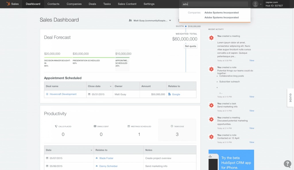 Hubspot CRM (CRM คือ กลยุทธ์การบริหารจัดการความสัมพันธ์ระหว่างบริษัทกับลูกค้า) มีความน่าสนใจตรงที่เขาเคลมว่าสามารถใช้งานได้ฟรี 100% แถมตลอดกาลอีกต่างหาก มันมีความสามารถในการบันทึกกิจกรรมที่เคยปฏิสัมพันธ์กับลูกค้า รายการสั่งซื้อในอดีตของลูกค้า ฯลฯ ความสามารถส่วนใหญ่จะเกี่ยวกับการขายเป็นหลัก ดังนั้นจึงเหมาะกับการให้ทีมพนักงานขายใช้มากเลยล่ะ