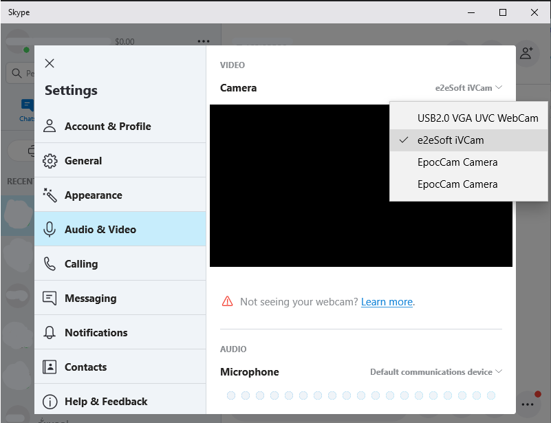 การเชื่อมต่อกับ Skype สามารถทำได้โดยการไปที่เมนู Settings ที่อยู่ด้านขวามือของชื่อแอคเคาท์ จากนั้นกดเข้าไปที่เมนู Audio & Video > Camera และเลือกที่ e2eSoft iVCam