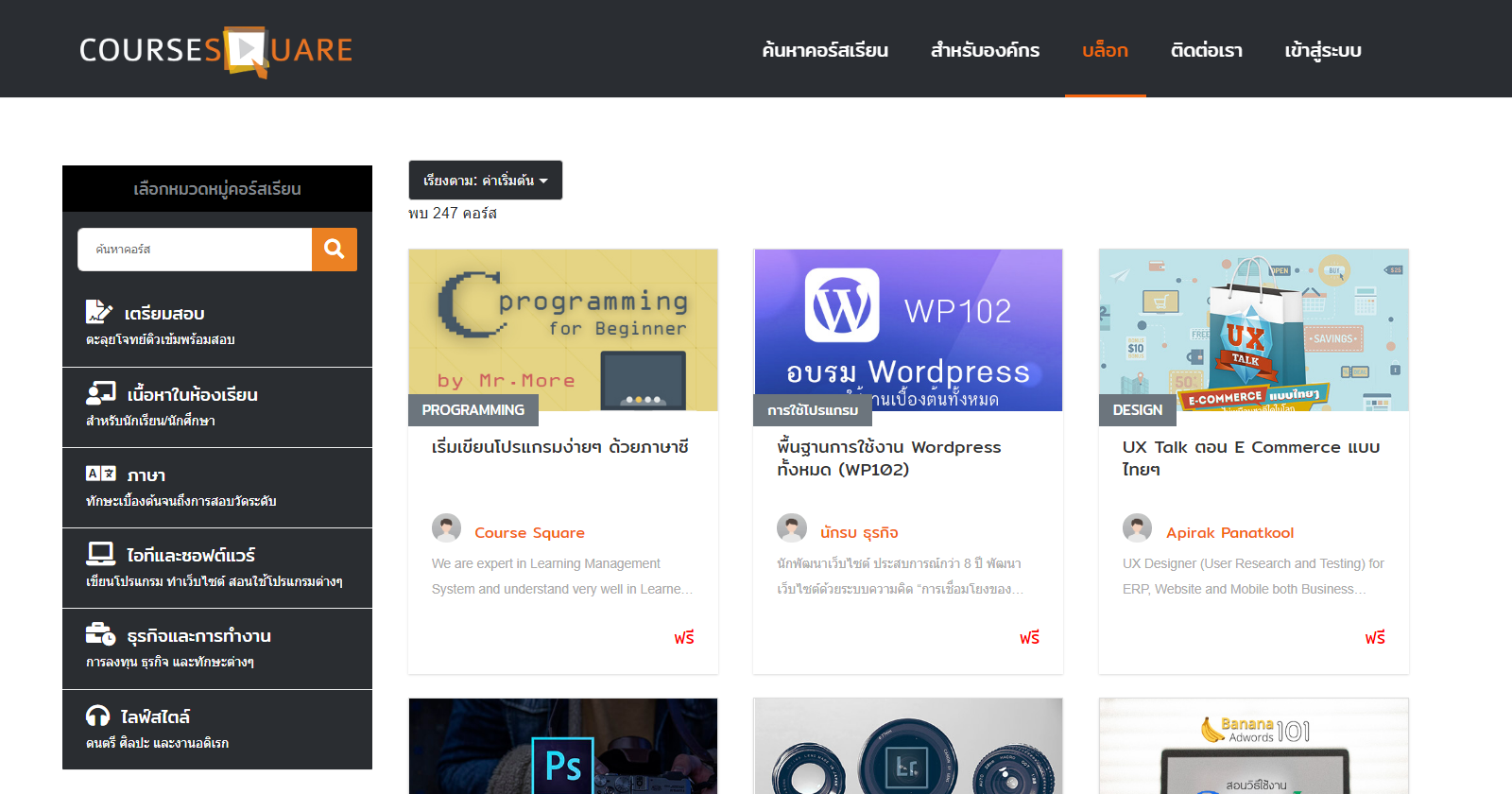 อีกหนึ่งเว็บไซต์ที่รวมคอร์สออนไลน์ไว้มากมายอย่าง CourseSquare ทั้งคอร์สเรียนฟรีและคอร์สที่มีค่าใช้จ่าย ซึ่งคอร์สออนไลน์ใน CourseSquare มีความหลากหลายมากๆ ตั้งแต่คอร์สสอนใช้งานโปรแกรมต่างๆ คอร์สติวภาษา คอร์สติวสอบเข้า รวมถึงคอร์สสอนพิเศษสำหรับนักเรียน ม.ต้นและนักเรียน ม.ปลาย นับว่าเป็นเว็บไซต์คอร์สออนไลน์ที่เข้าถึงทุกเพศ ทุกวัยอย่างแท้จริง