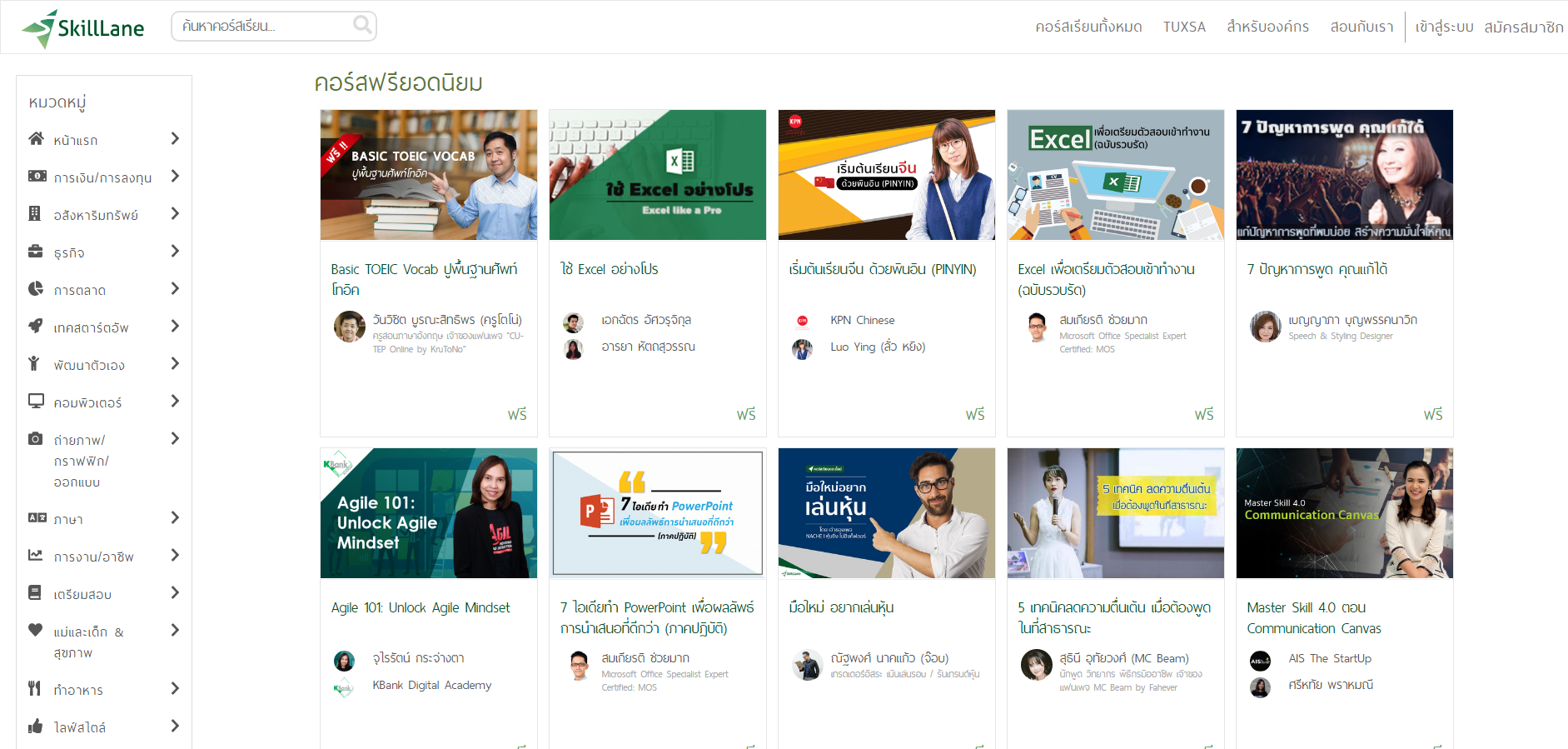 อีกหนึ่งเว็บไซต์รวมคอร์สเรียนออนไลน์หน้าใหม่ที่มีวิชาให้เลือกเรียนเต็มไปหมด อย่าง Skilllane ที่มีให้เลือกทั้งคอร์สเรียนฟรีและคอร์สเสียเงิน แต่เอาแค่หัวข้อในหมวดคอร์สเรียนฟรีก็ถือว่ามีประโยชน์ต่อการทำงานและการใช้ชีวิตมากๆ เช่น Tips & Tricks การใช้งานโปรแกรมคอมพิวเตอร์ คอร์สติวสอบ คอร์สสอนภาษา คอร์สสอนการลงทุนประเภทต่างๆ ทั้งจากวิทยากรชื่อดังและองค์กรชั้นนำ รับรองว่าถ้าได้ลองเรียนบน SkillLane จะไม่มีวันเบื่อการเรียนอีกเลย