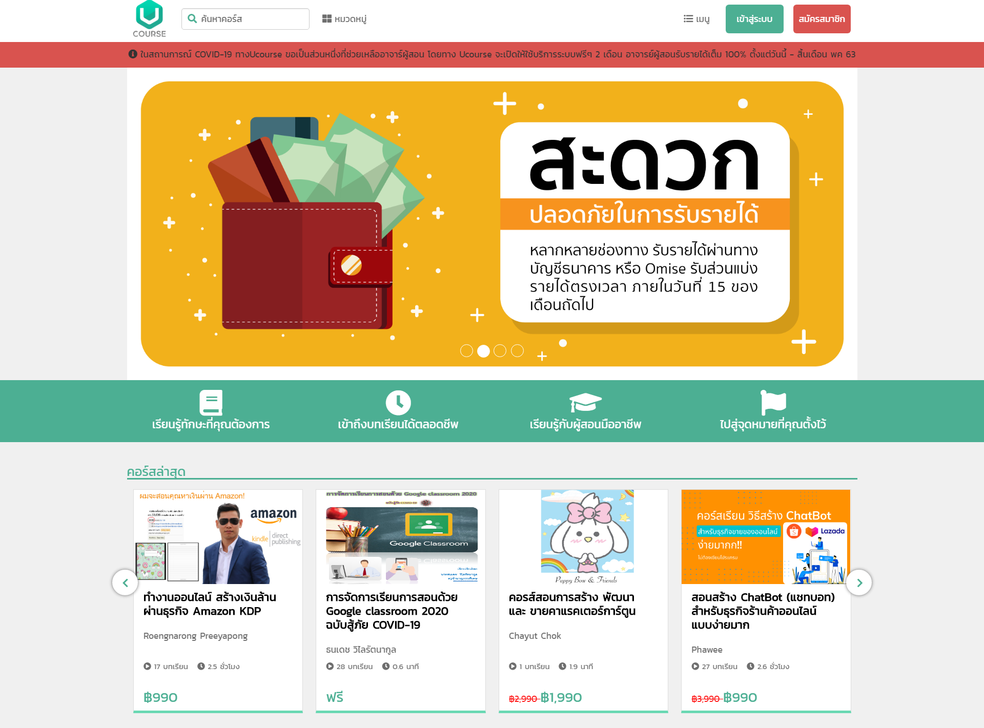 ส่วน Ucourse ก็เป็นเว็บไซต์คอร์สเรียนออนไลน์ที่น่าสนใจเช่นกัน แต่ในส่วนของคอร์สฟรีนั้นยังมีให้เลือกน้อยไปนิด แต่ราคาเริ่มต้นของคอร์สเรียนที่นี่เริ่มต้นเพียงหลักร้อยเท่านั้น ถือว่าไม่แพงเลย และในช่วง COVID-19 แบบนี้ บางคอร์สลดราคากระหน่ำแบบหาที่ไหนไม่ได้อีกแล้ว ถ้าไม่อยากพลาดคอร์สดีๆ เรียนรู้จากที่ไหนก็ได้ทั่วโลก ลองสำรวจคอร์สออนไลน์จาก Ucourse ไว้เป็นอีกทางเลือกก็ดีนะ