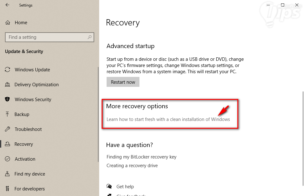 การใช้คำสั่ง Fresh Start สามารถทำได้โดยไปที่ Settings → Update & Security → Recovery แล้วตรงหัวข้อ More Recovery Options จะมีลิงก์จืดจางเหมือนไม่อยากให้เรากดเขียนว่า "Learn how to start fresh with a clean installation of Windows" ให้กดคลิกเข้าไปได้เลย
