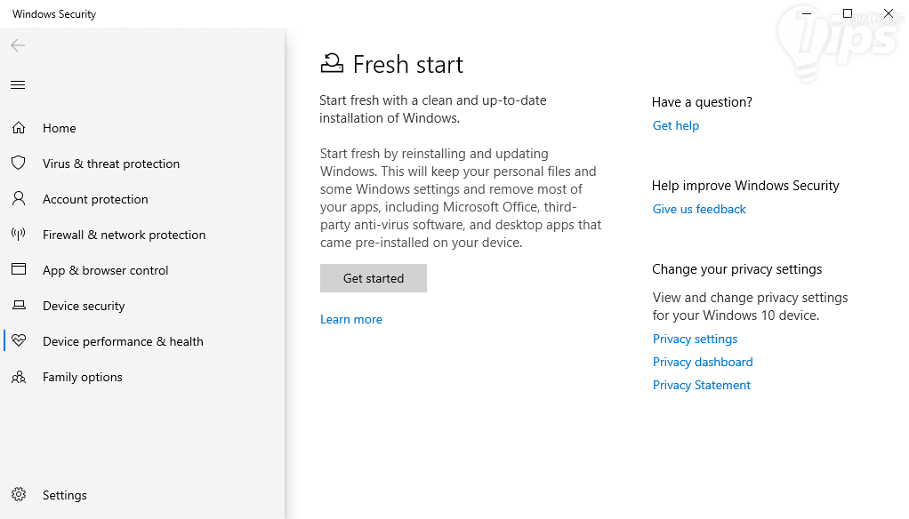 หลังจากคลิกจะมีหน้าต่างแจ้งเตือนจาก Windows Security ว่าแน่ใจนะ จะไปต่อจริงหรือเปล่า ก็คลิกยืนยันไปครับ ก็จะเข้าสู่หน้าเมนู Fresh Start สามารถคลิก Get Started เพื่อเริ่มดำเนินการได้เลย (แน่นอนว่าอย่าลืมสำรองข้อมูลก่อนด้วยนะครับ ขอย้ำอีกที)