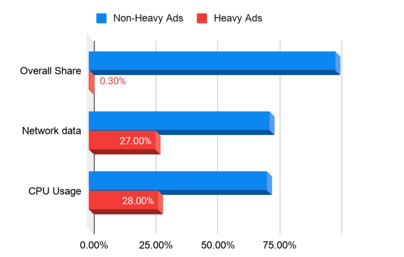 Marshall Vale ผู้รับผิดชอบโครงการ Chrome ได้ระบุว่า แม้โฆษณาที่ใช้ทรัพยากรสูงจะมีแค่ประมาณ 0.3% แต่มันก็ใช้ทรัพยากรของ หน่วยประมวลผลกลาง หรือ CPU มากถึง 28% และปริมาณข้อมูลในเครือข่ายถึง 27% แน่นอนว่าการใช้ทรัพยากรเหล่านี้ ส่งผลกระทบต่ออัตราการกินไฟเพิ่มขึ้นด้วย หากคุณใช้งานโน้ตบุ๊ค นั่นหมายความว่าแบตเตอรี่ของคุณจะหมดเร็วขึ้น