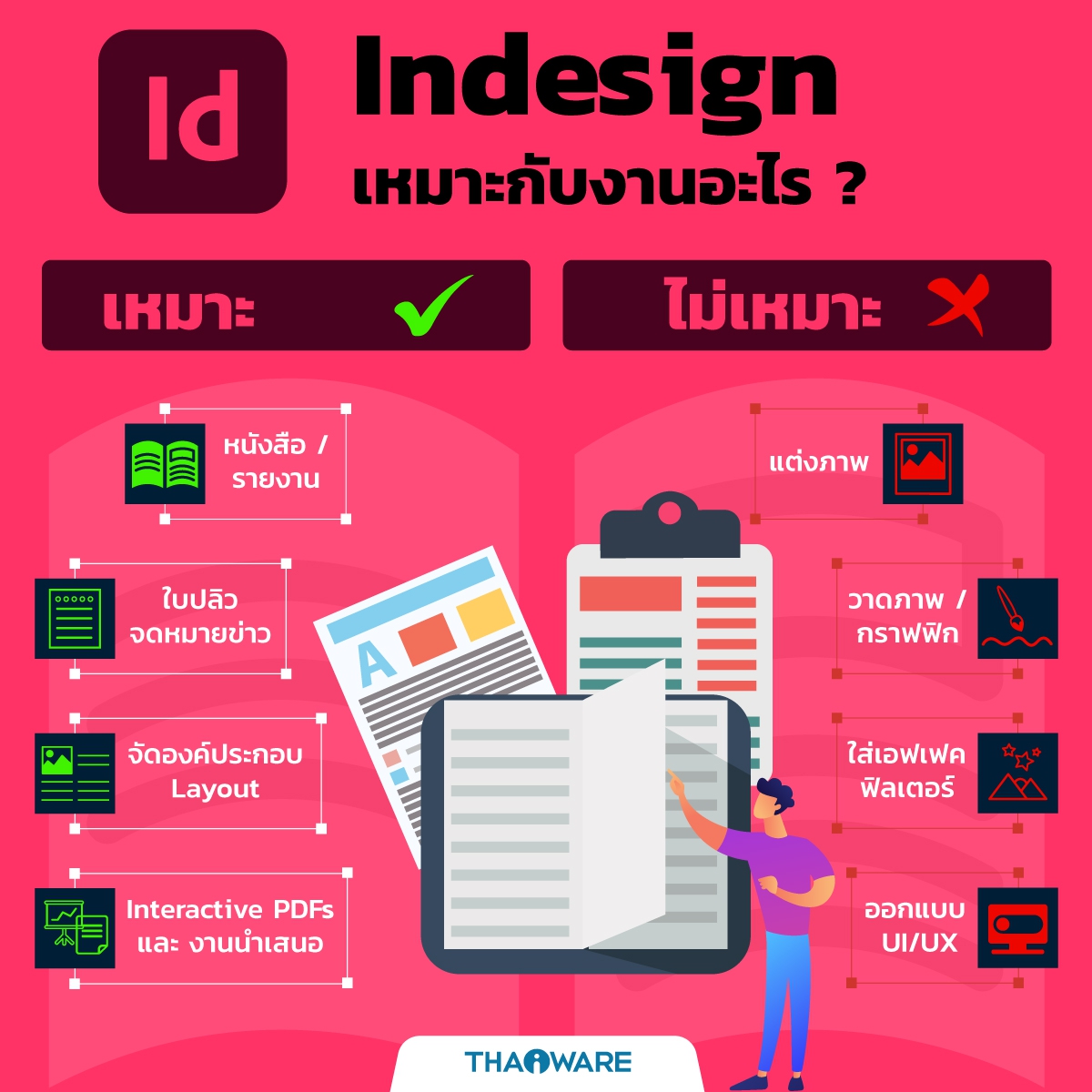 ใครที่คิดจะใช้โปรแกรมเพื่อทำหนังสือ, เรียงข้อความ, โบรชัวร์, แผ่นพับ หรือ สื่อใด ๆ ก็ตามที่เกี่ยวกับการพิมพ์ โปรแกรม InDesign นั้นตอบโจทย์ได้เป็นอย่างดี ทำให้การจัดเนื้อหาหนังสือจำนวนหลาย ๆ เล่ม เป็นไปได้อย่างง่ายดาย พร้อมทั้งรองรับการทำสื่อในรูปแบบโต้ตอบได้ (Interactive) และ PDF กับ EPUB ที่สามารถ เผยแพร่ในรูปแบบออนไลน์ ได้อีกด้วย