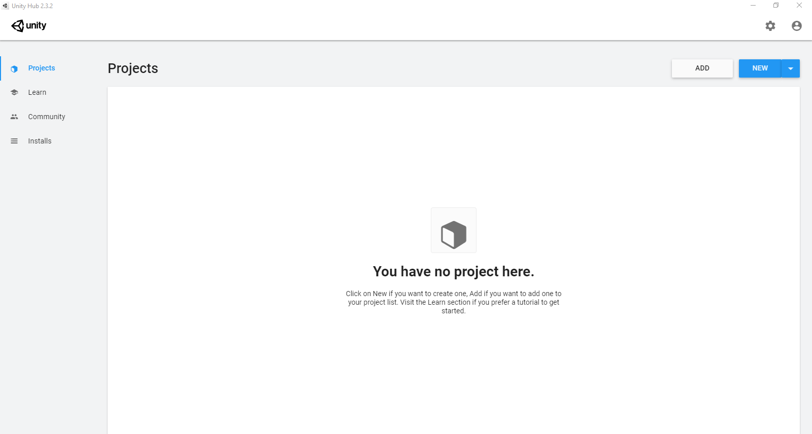 เปิดโปรแกรมสร้างเกม Unity ขึ้นมา หน้าแรกจะได้แบบนี้ ให้กด New เพื่อเริ่มโปรเจคใหม่