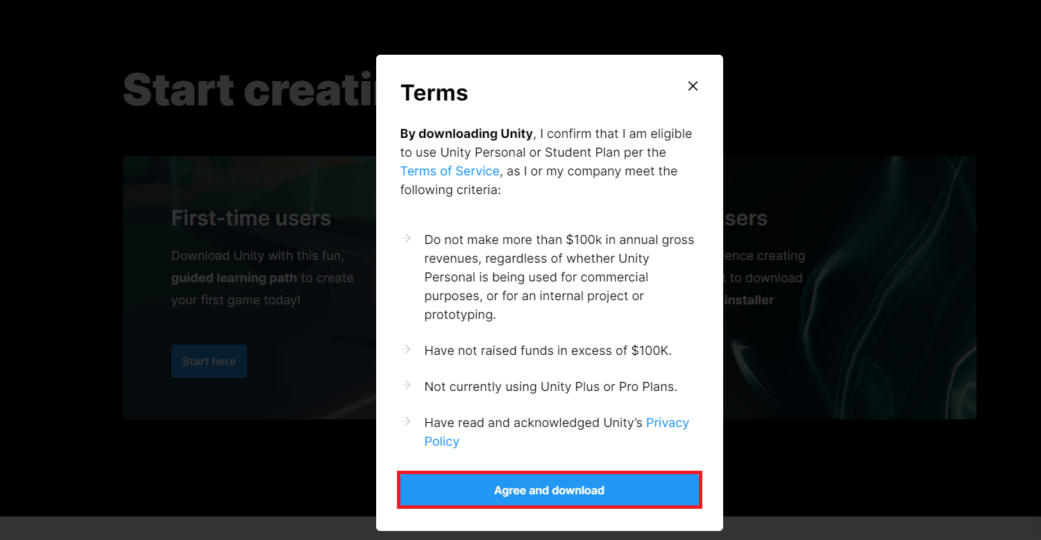 หน้านี้จะเป็นข้อตกลงและเงื่อนไขในการใช้ Unity แบบ Personal เมื่ออ่านทำความเข้าใจเสร็จ กด "ปุ่ม Agree and download" และติดตั้งโปรแกรม