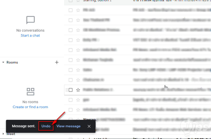 เมื่อเรากดส่งเมล ด้านซ้ายล่างสุดของกล่องอีเมลขาเข้า (Inbox) จะมี "แท็บ Message Sent." ปรากฏขึ้นมา พร้อม "ปุ่ม Undo" และ "ปุ่ม View Message" ซึ่งจะปรากฏไว้ตามระยะเวลาที่เราเลือก ถ้าต้องการยกเลิกอีเมลที่เพิ่งกดส่งไป ก็สามารถกดที่ "ปุ่ม Undo" ได้ทันที