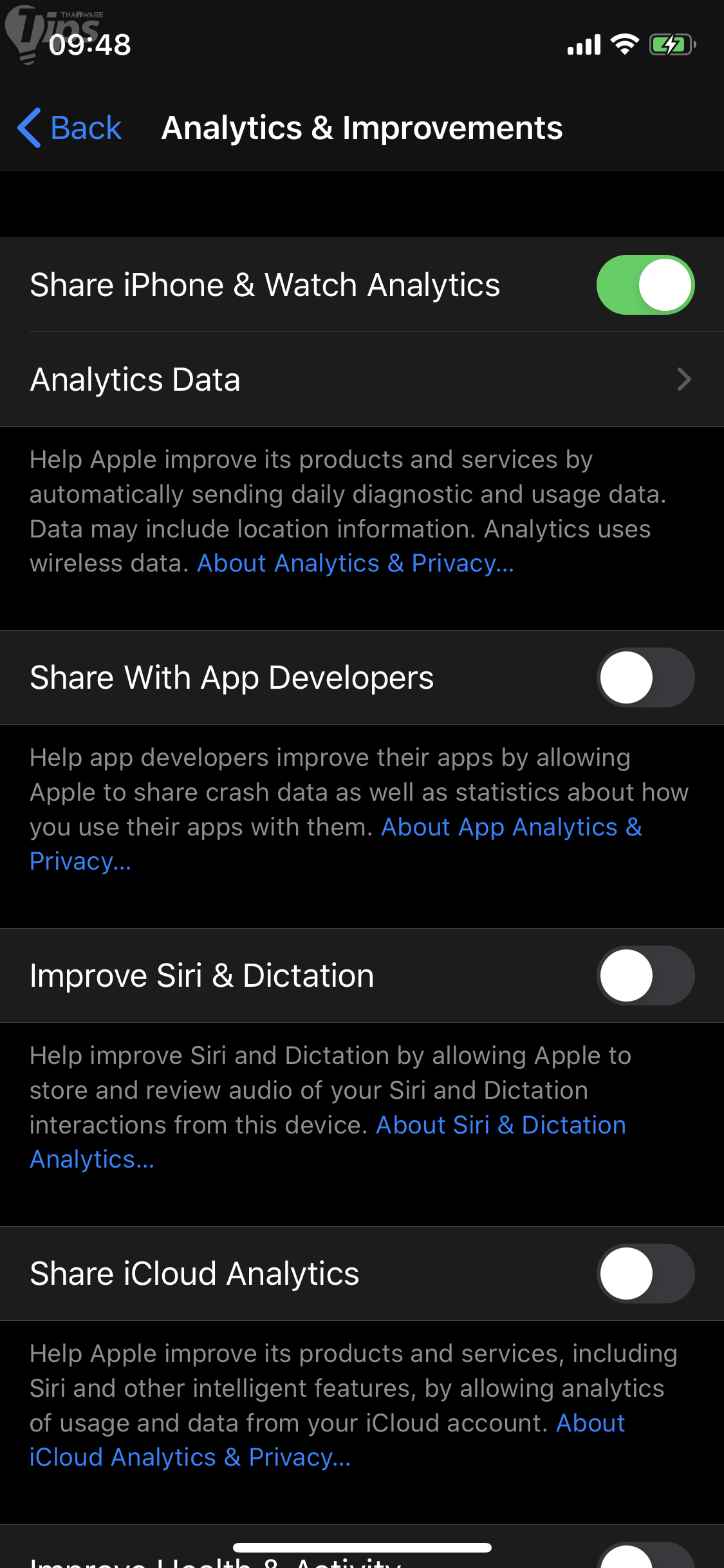 บน iPhone ให้เราไปที่ Settings >> Privacy >> Analytics & Improvements ซึ่งเราจำเป็นต้องเปิดการทำงานตรง Share iPhone & Watch Analytics เอาไว้ด้วยนะครับ