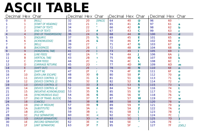 รหัส 0-31 มีไว้ใช้เพื่อควบคุมโปรแกรม ดังนั้นมันจะไม่แสดงผล ส่วนรหัสที่เหลือจะแทนอักษร และสัญลักษณ์ต่างๆ ที่ใช้งานโดยทั่วไป