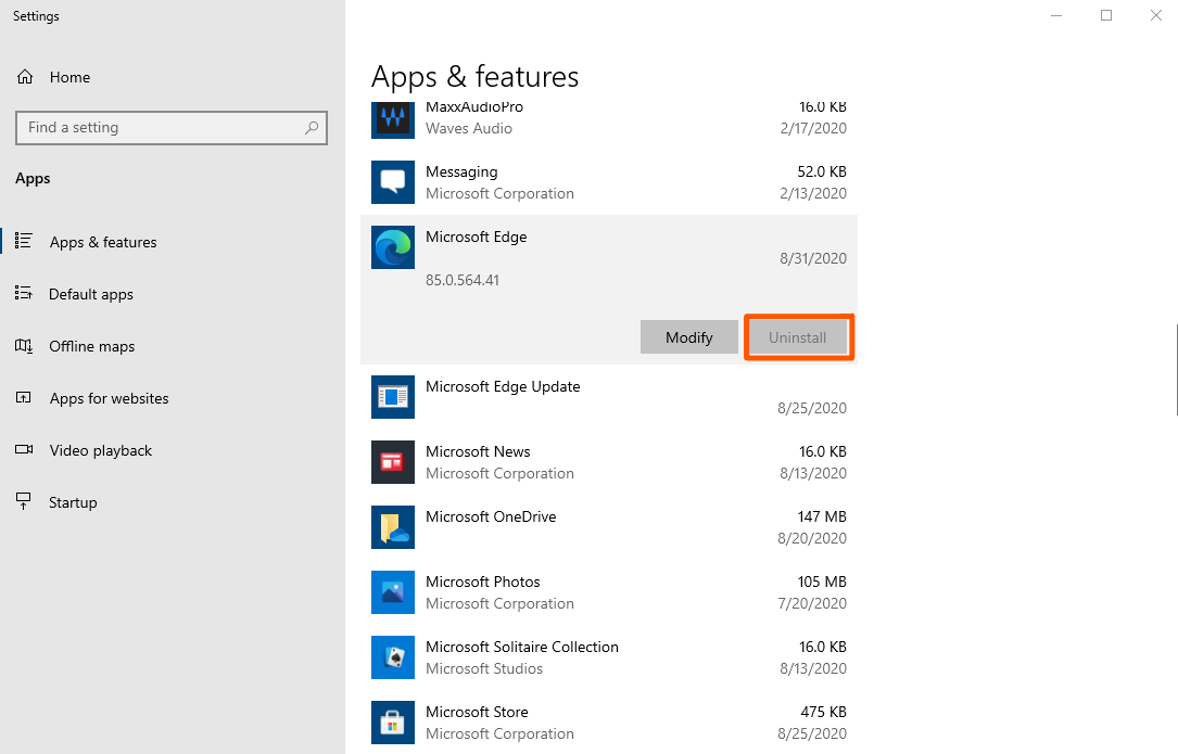 เพราะเมื่อไปที่ Control Panel และกด Uninstall ที่ Programs and Features เหมือนกับการ Uninstall โปรแกรมทั่วไป ชื่อของ Edge จะหายไปจากหน้า Control Panel แต่เราก็ยังเห็นมันบนเครื่องอยู่ดี หรือหากไปที่ Apps & features ในเมนู Setting ก็จะพบว่าไอคอนการ Uninstall ของ Edge กลายเป็นสีเทาที่ไม่สามารถกดเพื่อ Uninstall ออกจากเครื่องได้
