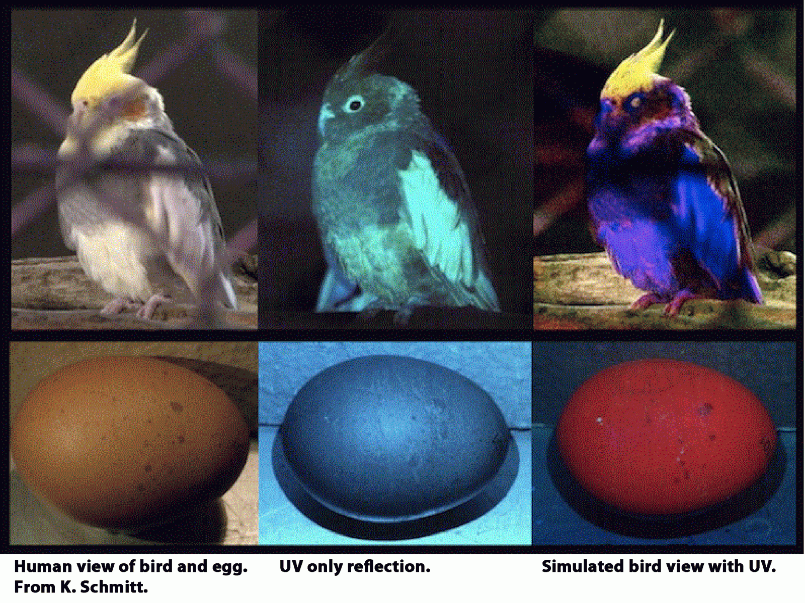 นกมีความสามารถในการมองเห็นและการรับสีที่สูงกว่ามนุษย์อย่างเราไปอีกขั้นหนึ่ง เพราะไม่เพียงแต่มันจะสามารถรับสีได้ทั้งแดง, เขียว และน้ำเงินเหมือนกับมนุษย์แล้ว มันยังมี Cone Cells พิเศษที่สามารถรับสเปกตรัมของ อัลตราไวโอเลต ได้อีกต่างหาก