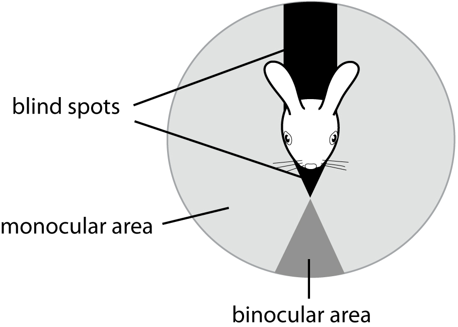 ส่วนกระต่ายที่มีดวงตาอยู่บริเวณข้างกะโหลกนั้น มีลักษณะการมองเห็นที่ค่อนข้างพิเศษ คือ มีขอบเขตการ มองเห็นเกือบ 360 องศา สามารถมองเห็นได้ทั้งแบบ Binocular (การใช้ดวงตาทั้งสองข้างจับภาพในระยะใกล้) และ Monocular หรือการมองภาพแบบใช้ลูกตาเพียงข้างเดียว (ซ้าย-ขวา) ในการจับภาพสิ่งรอบข้าง ทำให้มองเห็นสิ่งที่อยู่ไกลๆ ได้ดี โดยจุดบอดของสายตาจะอยู่ที่บริเวณปลายจมูกและหลังใบหู