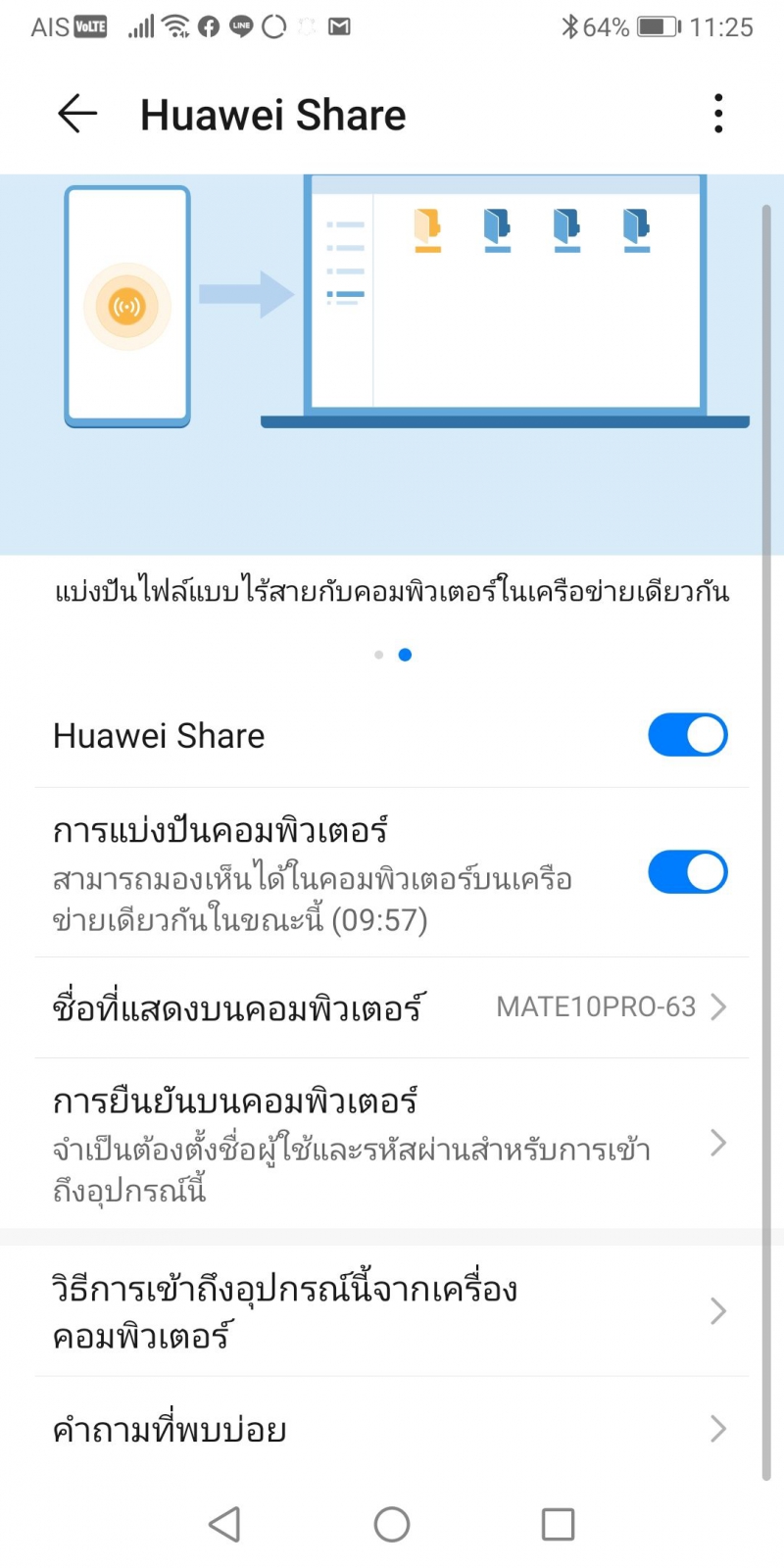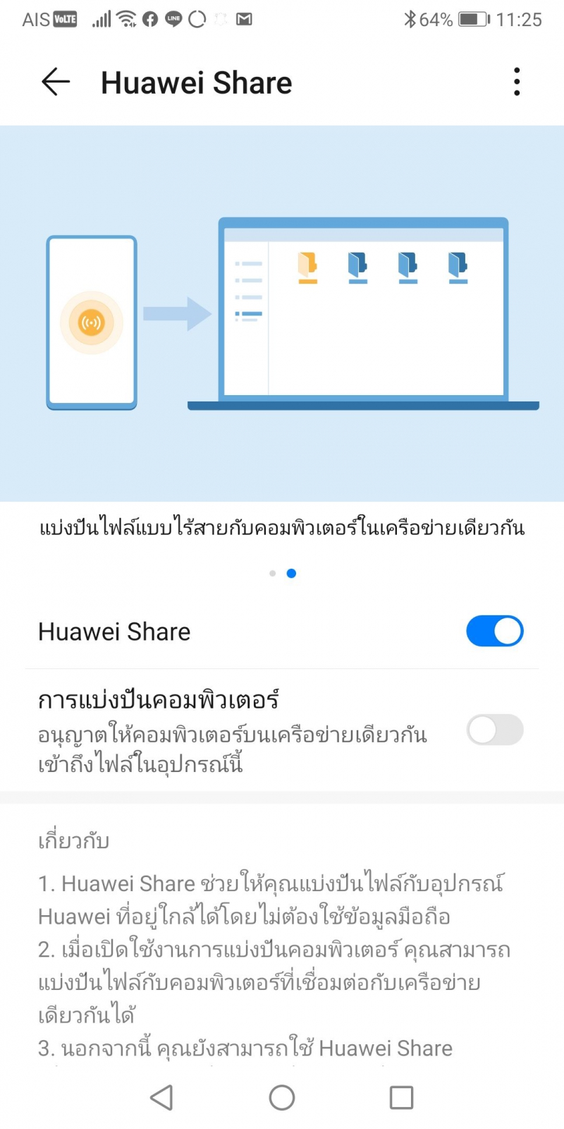 ที่พิเศษคือเวลาคุณเปิดใช้ HUAWEI Share คุณสามารถเชื่อมต่อผ่านเครื่อง PC ที่ใช้ระบบปฏิบัติการ Windows และ Mac ได้ด้วยโปรโตคอล Server Message Block (SMB) เพื่อใช้ในการถ่ายโอนรูปภาพ และวิดีโอที่ต้องการได้เหมือนกัน