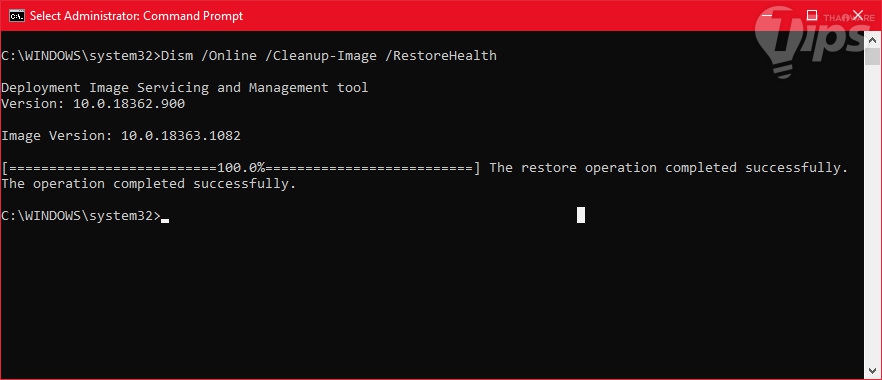 หลังสแกนเสร็จสิ้น หาก DISM รายงานว่าพบปัญหาในระบบไฟล์ (ภาพด้านบนคือไม่พบความผิดปกติ) เราก็จะใช้อีกคำสั่งเพื่อให้ DISM เชื่อมต่อไปยัง Windows Update เพื่อดาวน์โหลดไฟล์ใหม่มาซ่อมแซม นั่นคือ