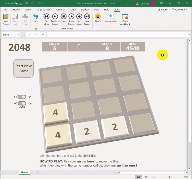 เป้าหมายของเกมคือการเลื่อนรวมผลลัพธ์ให้ได้ 2048 ให้ได้ ซึ่งไม่ใช่เรื่องง่ายนะ บอกเลย สำหรับตัวเกมเวอร์ชัน Excel ก็ทำมาเหมือนกับที่เราเล่นบนสมาร์ทโฟนเป๊ะ สามารถปรับโหมดการเล่นเป็นแบบ 3 มิติได้ด้วย