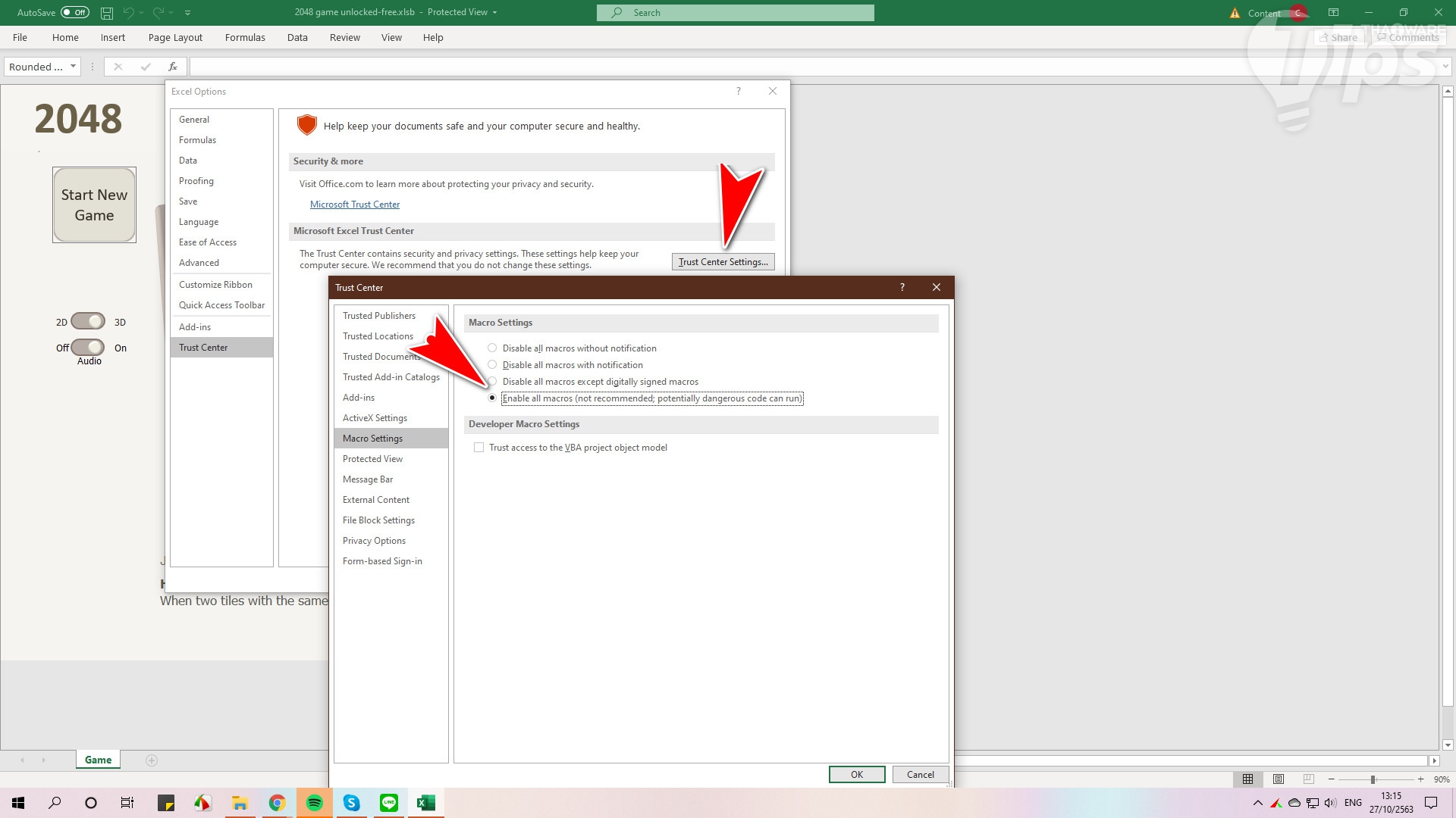 เกม 2048 จำเป็นต้องเปิดใช้งานคุณสมบัติ Macro ใน Excel ก่อนนะครับ ถึงจะเล่นได้ โดยการคลิกไปที่เมนู File → Options → Trust Center → Trust Center Settings... → Macro Settings แล้วเลือก Enable all macros