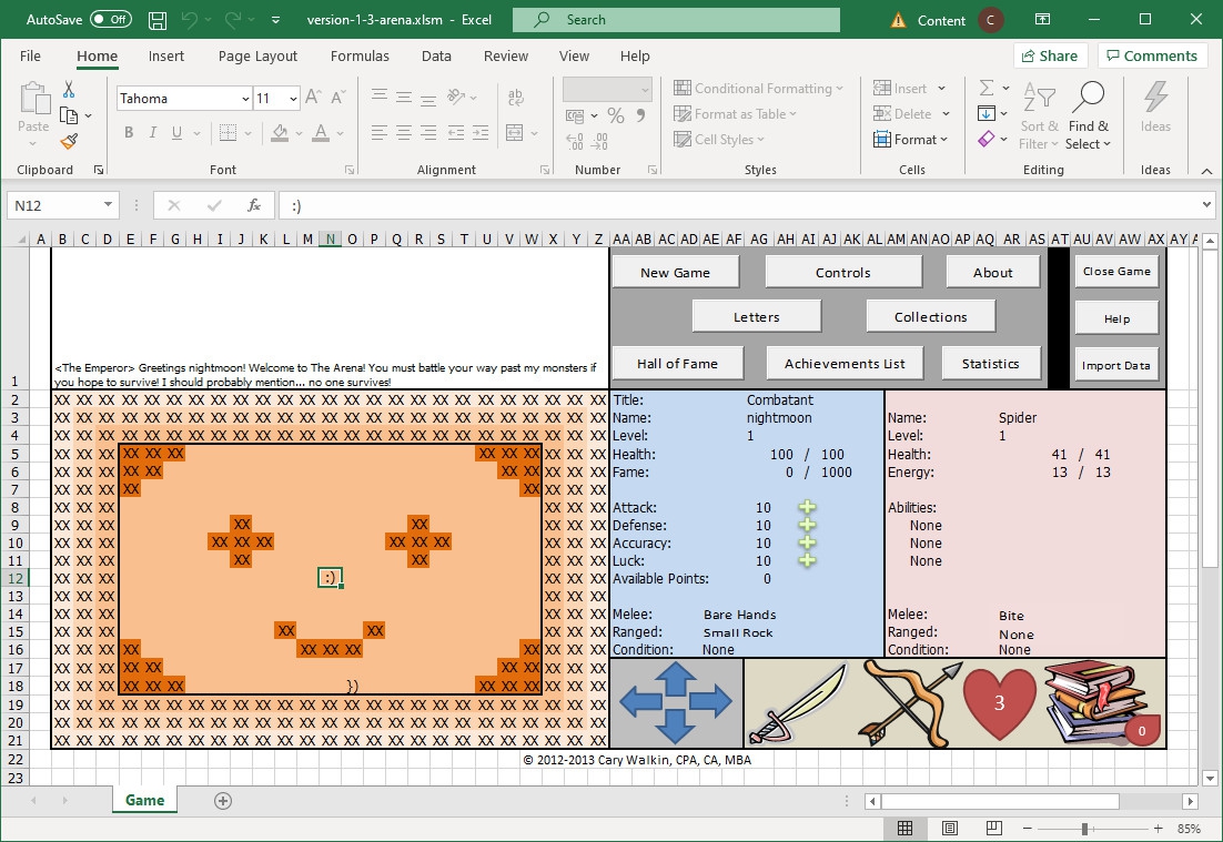 นอกจากเล่นผ่าน Excel แล้ว เกม Arena.Xlsm ยังมีให้เล่นผ่าน Itch.io (https://carywalkin.itch.io/arenaxlsm?download) ได้ด้วยนะ
