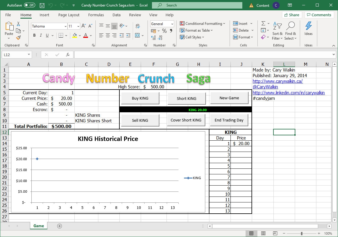เกมนี้สร้างโดย Cary Walki นักพัฒนาชาวแคนาดาคนเดียวกันกับคนสร้าง Arena.Xlsm และมีให้เล่นบน Itch.io ด้วยเช่นกัน (https://carywalkin.itch.io/candy-number-crunch-saga)