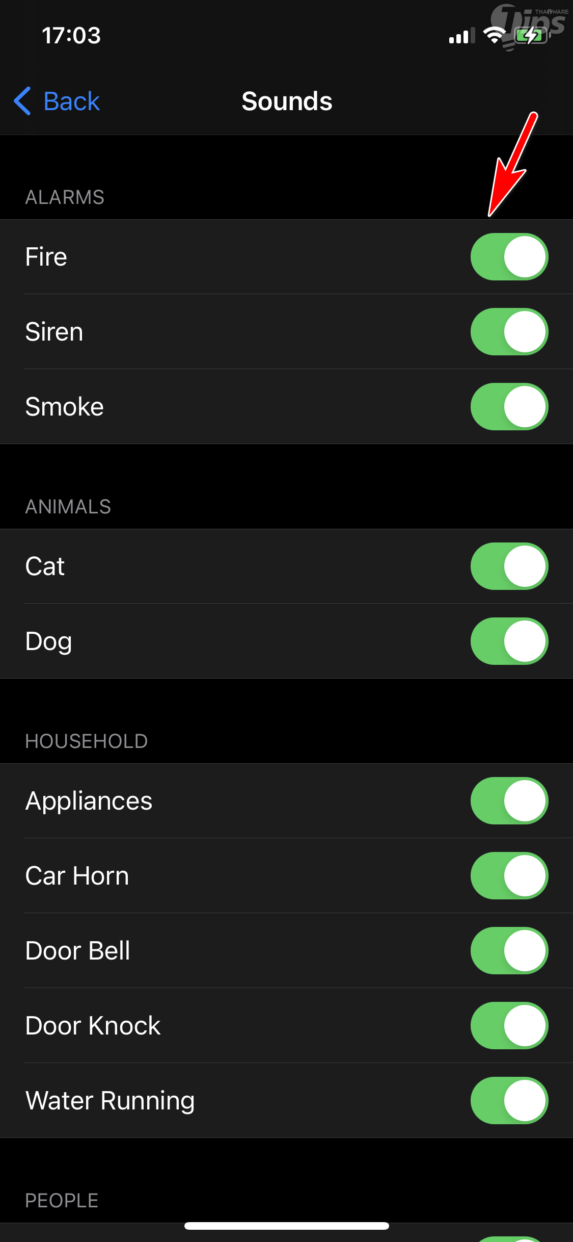แตะเปิดใช้งาน Sound Recognition จากนั้นจะมีแถบเมนู Sounds แสดงเพิ่มขึ้นมาด้านล่าง พอแตะเข้าไปจะมีให้เราเลือกว่า ต้องการให้มันแจ้งเตือนเสียงประเภทไหนบ้าง ก็จะมีพวกสัญญาณไฟไหม้, ไซเรน, หมา, แมว, แตร, เด็กร้อง ฯลฯ ก็เลือกที่เปิดอันต้องการใช้งานไปครับ