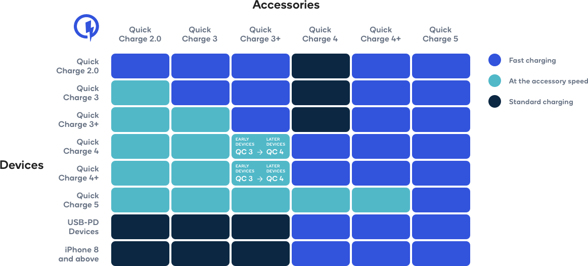 Quick Charge ของ Qualcomm จัดเป็นผู้บุกเบิกเทคโนโลยีชาร์จเร็วรายแรกในวงการสมาร์ทโฟน และสมาร์ทโฟนส่วนใหญ่ก็รองรับเทคโนโลยีนี้ เป้าหมายหลักจึงอยู่ที่การใช้งานบนสมาร์ทโฟนเป็นหลัก
