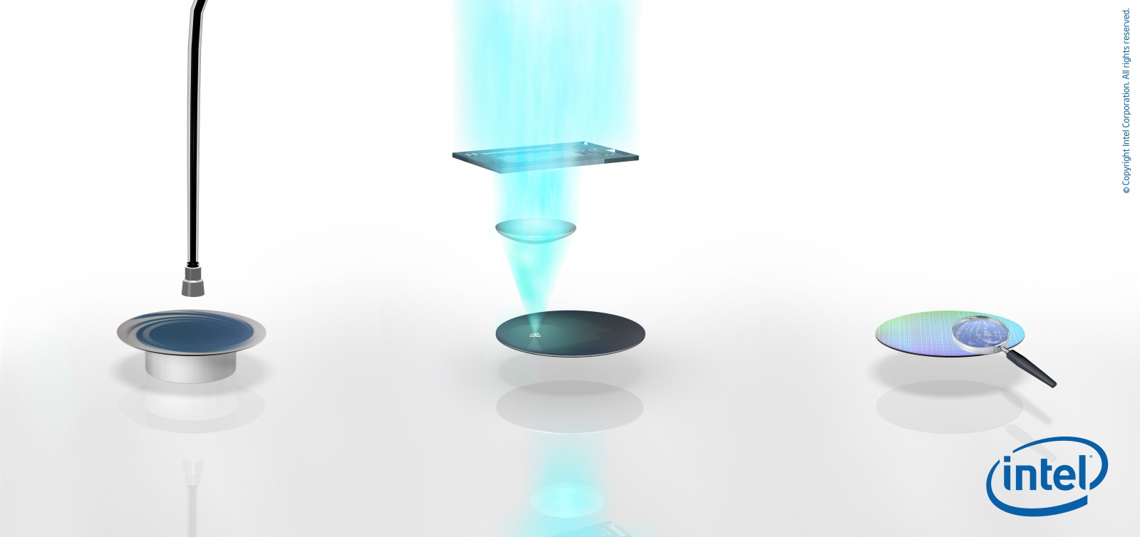 | Applying Photoresist เริ่มจากการเคลือบน้ำยาไวแสงบนแผ่นเวเฟอร์ หมุนไปเรื่อยๆ จนเต็มแผ่นสม่ำเสมอจนเกิดเป็นชั้นฟิลม์ที่ทนต่อการกัดกร่อน เพื่อจะนำไปสู่กระบวนการฉายเพื่อผลิตวงจรด้วยแสง และใช้เคมีชำระล้างส่วนที่ไม่ต้องการ | Exposure เมื่อแผ่นเวเฟอร์เคลือบน้ำยาแข็งตัวได้ที่ ให้บางส่วนโดนแสง UV เพื่อละลาย จากนั้นใช้การฉายแสงผ่านแผ่นกั้นและควบคุมด้วยเลนส์ เพื่อสร้างรูปแบบของวงจรแบบเฉพาะลงบนแผ่นเวเฟอร์ ด้วยขนาดและระยะที่พอเหมาะ ทำซ้ำไปเรื่อยๆ จนเต็มแผ่น | Resist Development ส่วนนี้จะเป็นการใช้สารเคมีชำระล้างส่วนที่ละลายออกจากแผ่นได้ หลังจากแผ่นการฉายแสงด้วยแผ่นภาพวงจร และตรวจสอบซ้ำอีกครั้ง |