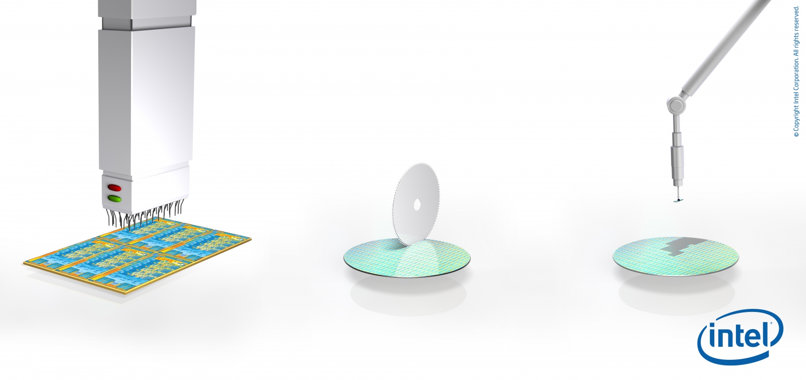 | Wafer Sort บนแผ่นเวเฟอร์ที่พร้อมสำหรับการใช้งาน จะถูกทดสอบทางไฟฟ้า โดยจะป้อนไฟฟ้าเข้าไปบนชิปทุกตัว เพื่อตรวจสอบค่าการทำงานเปรียบเทียบให้ได้ ค่าและคำตอบที่ถูกต้อง ตามที่กำหนดไว้ | Wafer Slicing เมื่อแผ่นเวเฟอร์ถูกตรวจสอบเรียบร้อย จะถูกนำไปตัดเป็นชิ้นแยกกัน เรียกว่า ได (Die) หรือ ชิ้นวงจรไฟฟ้า โดยจะถูกชื่อรุ่นของสถาปัตยกรรมที่แตกต่างกันไป | Selecting Die for Packgaing ทำการคัดเลือกชิ้นส่วนได วงจรไฟฟ้าที่ผ่านการตรวจทดสอบที่ถูกต้อง เพื่อจะนำไปบรรจุต่อไป |