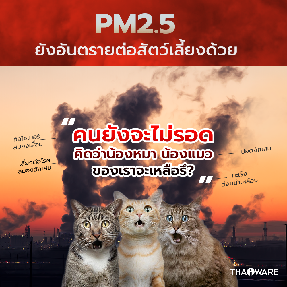 และไม่เพียงแต่จะเป็นอันตรายต่อสุขภาพของมนุษย์เท่านั้น แต่มลพิษทางอากาศอย่างฝุ่น PM 2.5 นี้ยังส่ง ผลกระทบต่อสุขภาพสัตว์เลี้ยง ของเรา รวมทั้งสัตว์ป่าอื่นๆ อีกด้วยเช่นกัน